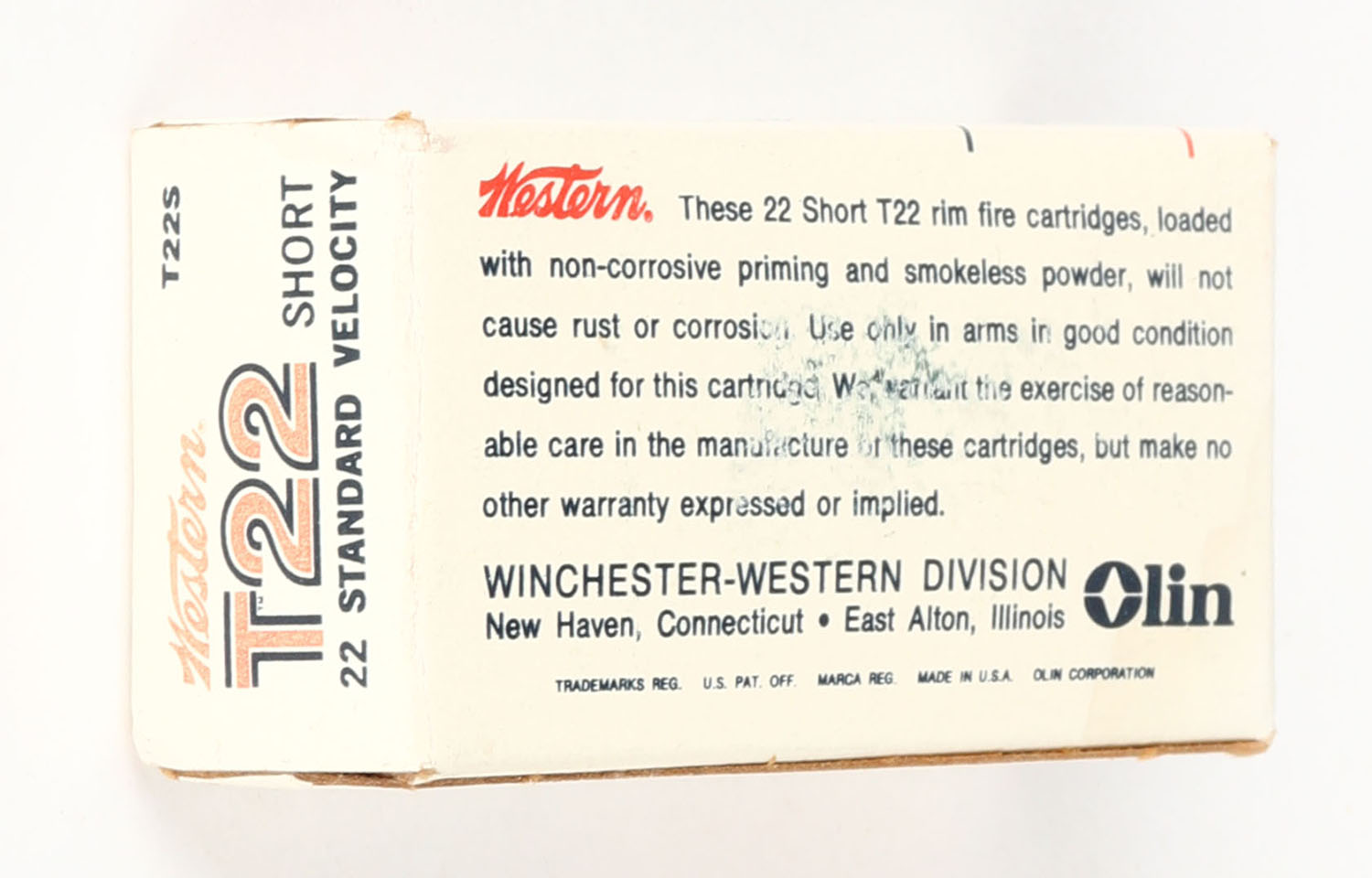 Western, T22, .22 Short, Standard Velocity, RHWeb: WCC-53A S-1a, Full, 1pc. White red & black box, box is solid with good color, color fading on top, some corner wear, edges are crisp, end flaps are solid, ammo is excellent. Grade: Very Good - Value: 6 to 14