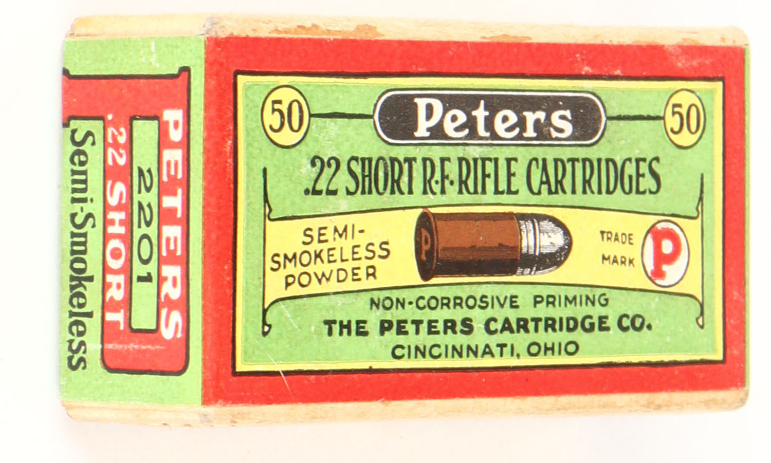 Peters, R.F. Rifle Cartridges, .22 Short, Semi-Smokeless Powder, RHWeb: PCC-5B S-1c, FULL & SEALED, 2pc. Buff box with green red & yellow wraparound label, box is MINT with minty color, corners are sharp, edges are crisp, label is intact. Grade: MINT - Value: 90 to 120