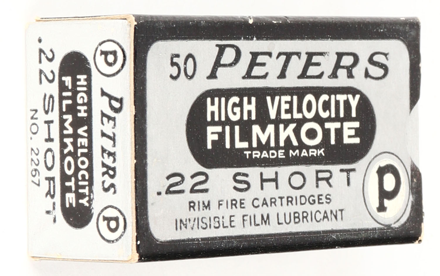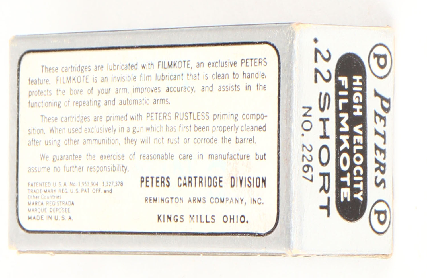 Peters, High Velocity Filmkote, .22 Short, RHWeb: PCC-13 S-1g, Full, 1pc. Silver black & white box, box is near mint with minty color, only very minor corner wear, edges are crisp, end flaps are solid, ammo is minty. Grade: Excellent ++ - Value: 14 to 22