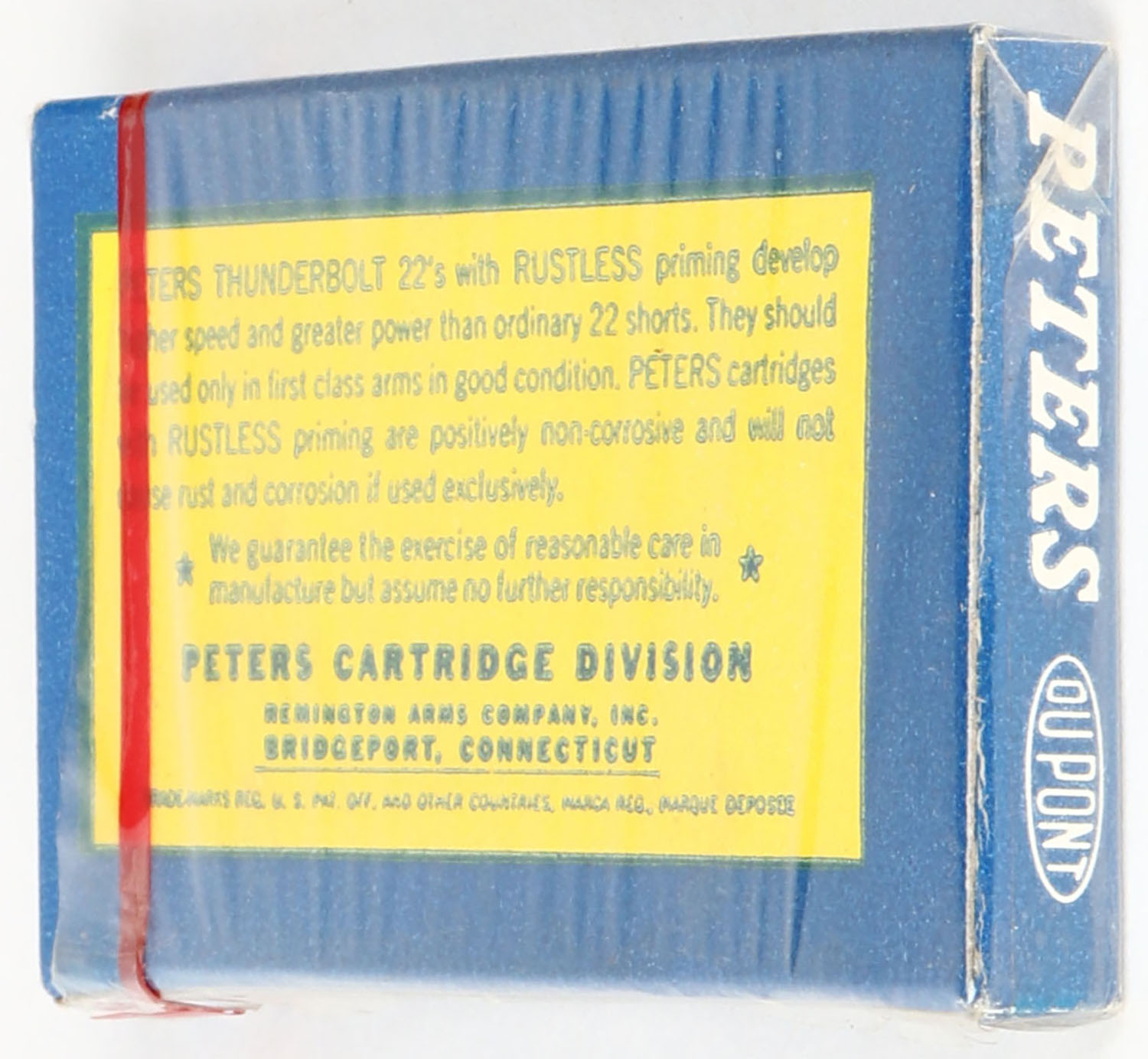 Peters, ''Thunderbolt'', .22 Short, RHWeb: PCC-17 S-5, Full, 1pc. Blue yellow & white flat pack, pack is solid with minty color, corners are sharp, edges are crisp, ammo appears very good, cellophane wrap is 95% intact. Grade: Excellent + - Value: 50 to 75
