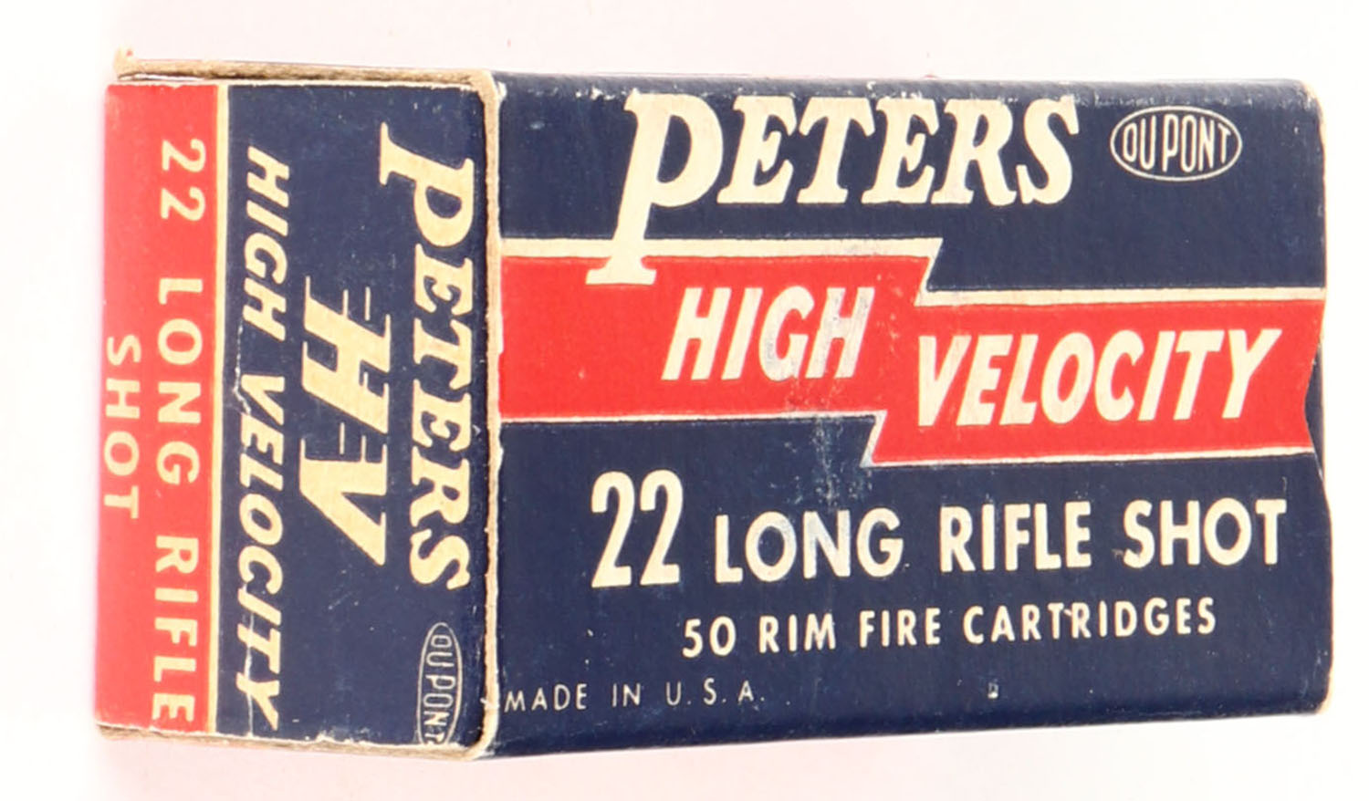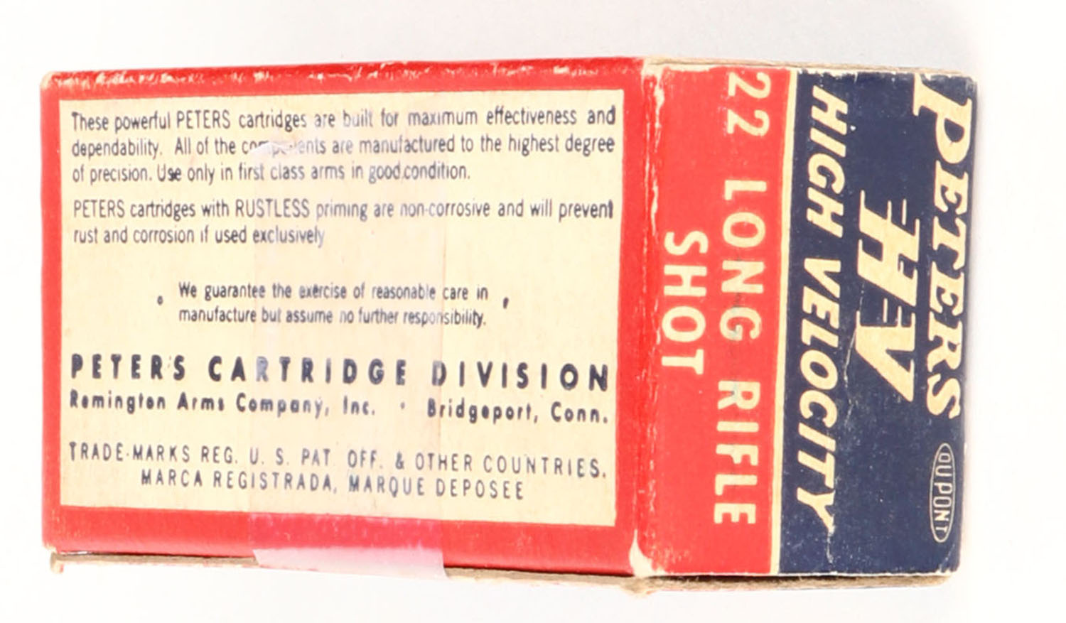 Peters, High Velocity, .22 Long Rifle Shot, RHWeb: PCC-17 LR-4, Partial 48rds. of U-6 H/S, box is solid with excellent color, very minor shelf & corner wear, edges are crisp, end flaps are solid, ammo is excellent. Grade: Excellent + - Value: 14 to 22