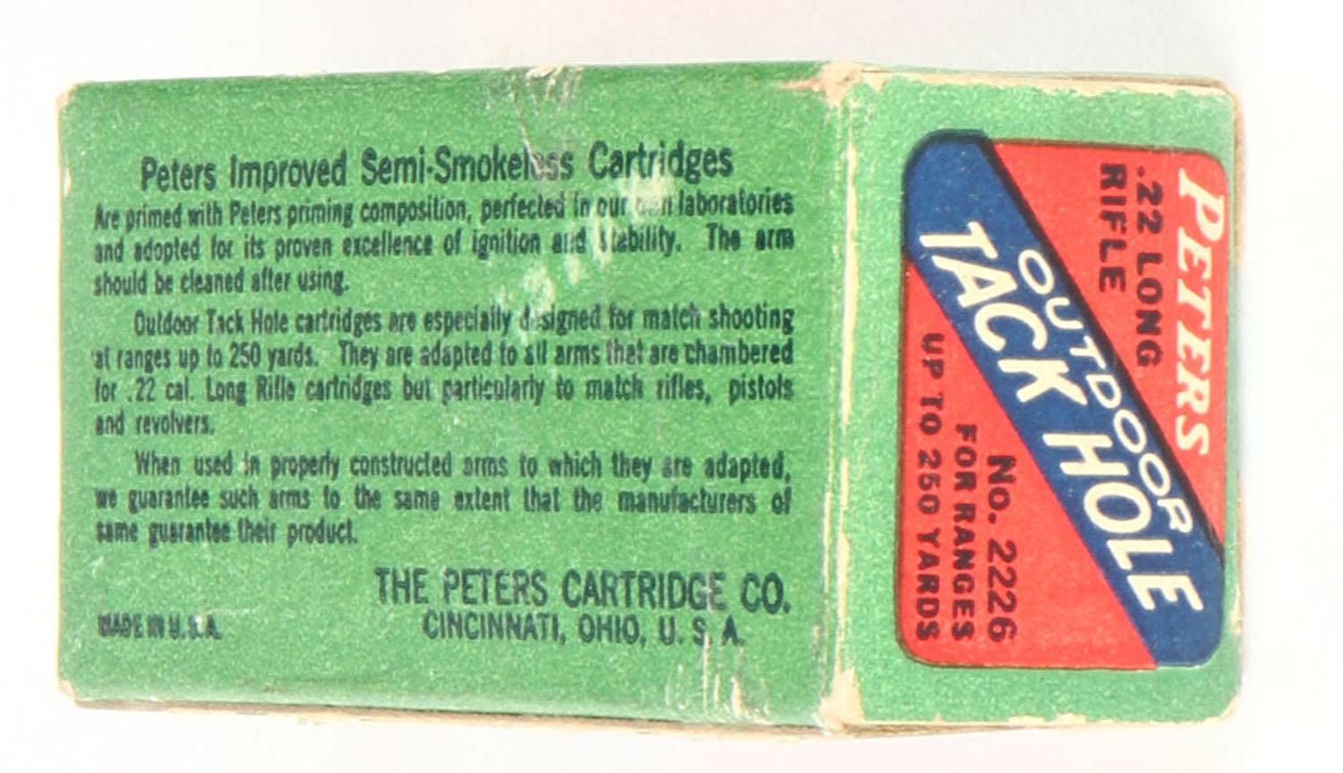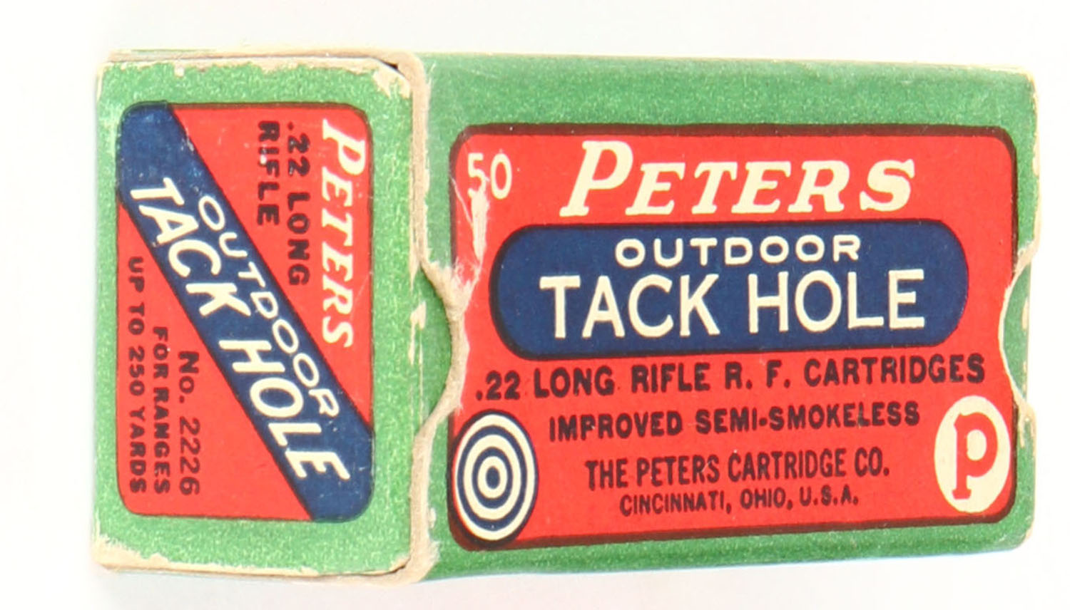 Peters, Outdoor Tack Hole, .22 Long Rifle, Improved Semi-Smokeless, Cincinnati, RHWeb: PCC-52 LR-9, Full, 1pc. Red green & blue box, box is solid with excellent color, minor edge & corner wear, end flaps are solid, ammo is very good. Grade: Excellent - Value: 70 to 90