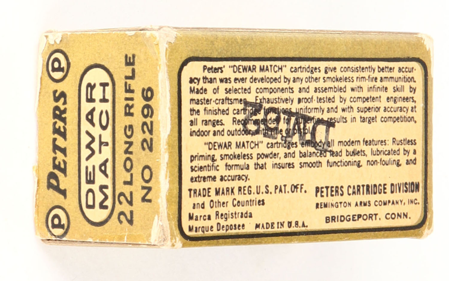 Peters, Dewar Match, .22 Long Rifle, RHWeb: PCC-53B LR-2c, Full, 1pc. Black & gold box, box is solid with excellent color, some corner wear, edges are mostly crisp, end flaps are solid, ammo is minty. Grade: Excellent - Value: 28 to 40