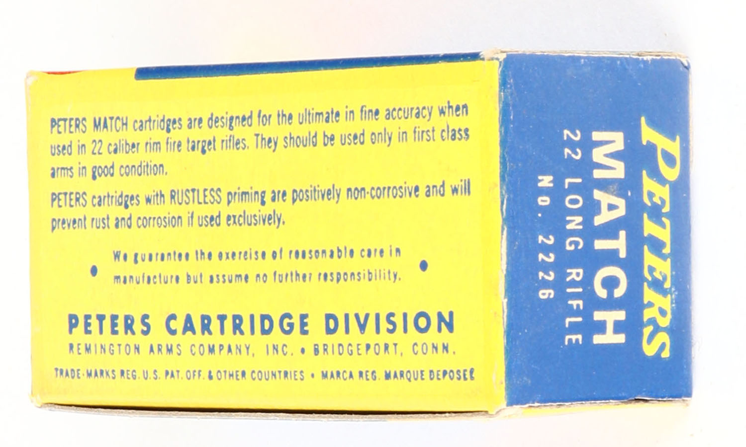 Peters, Match, .22 Long Rifle, For Rifle Shooting, RHWeb: PCC-55 LR-1d, Full, 1pc. Blue yellow & red box, box is solid with excellent color, very minor corner wear, edges are crisp, end flaps are solid, ammo is excellent. Grade: Excellent ++ - Value: 50 to 70