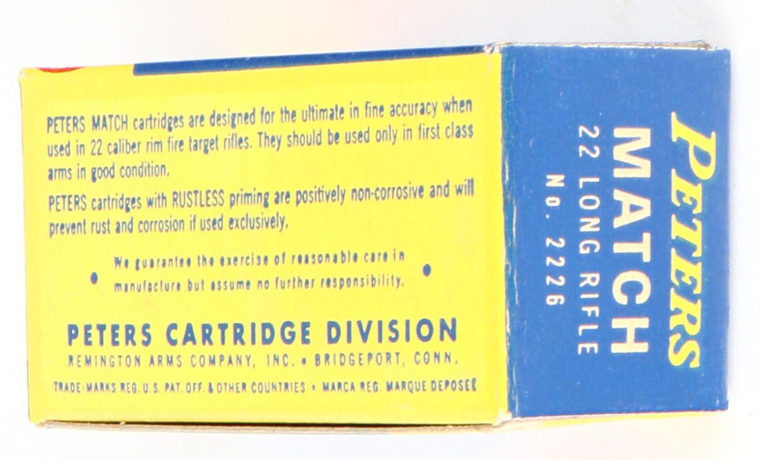 Peters, Match, .22 Long Rifle, For Rifle Shooting, RHWeb: PCC-55 LR-1d, Full, 1pc. Blue yellow & red box, box is solid with excellent color, very minor age soiling, corners are sharp, edges are crisp, end flaps are solid, ammo is excellent. Grade: Excellent ++ - Value: 50 to 70