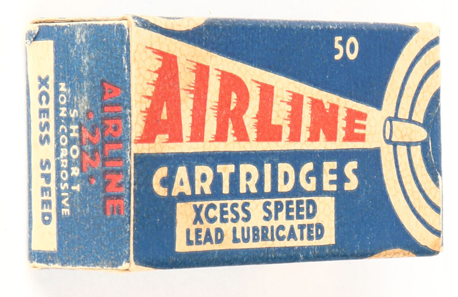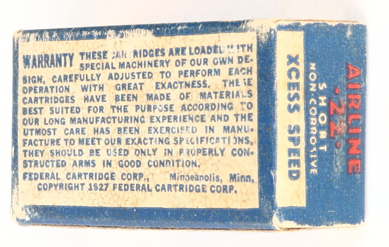 Federal, Airline, .22 Short, Lead Lubricated, RHWeb: FCC-4.3 S-7a, Full, 1pc. Blue white & red box, box is solid with very good to excellent color, minor age soiling & corner wear, edges are crisp, end flaps are solid, ammo is excellent. Grade: Excellent - Value: 20 to 30
