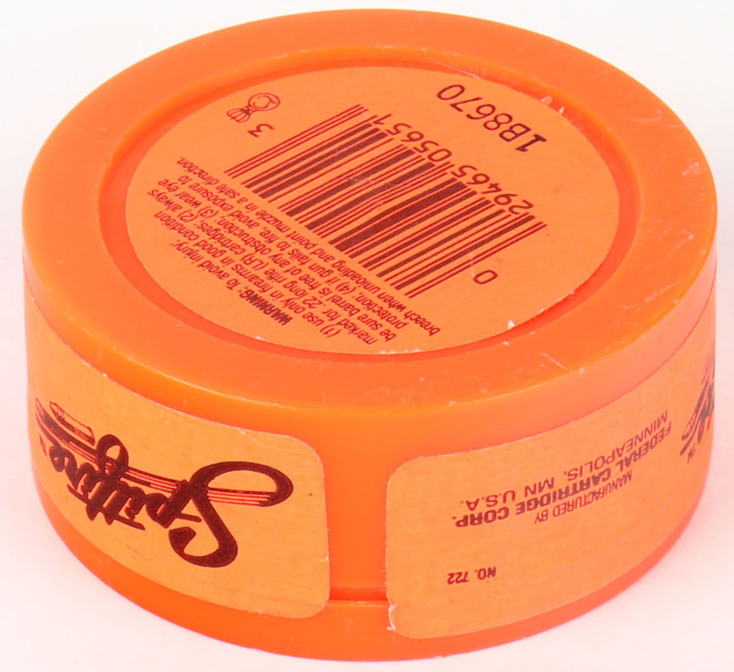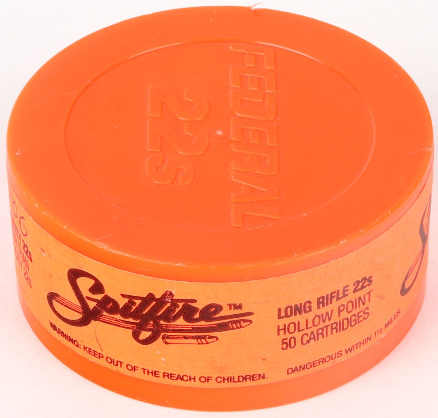 Federal, Spitfire, .22 Long Rifle Hollow Point, Hyper Velocity, RHWeb: FED-15 LR-4, FULL & SEALED, 2pc. Orange plastic can with orange sealing label, can is near mint with minty color, label has been written on, label is intact. Grade: Excellent ++ - Value: 16 to 24