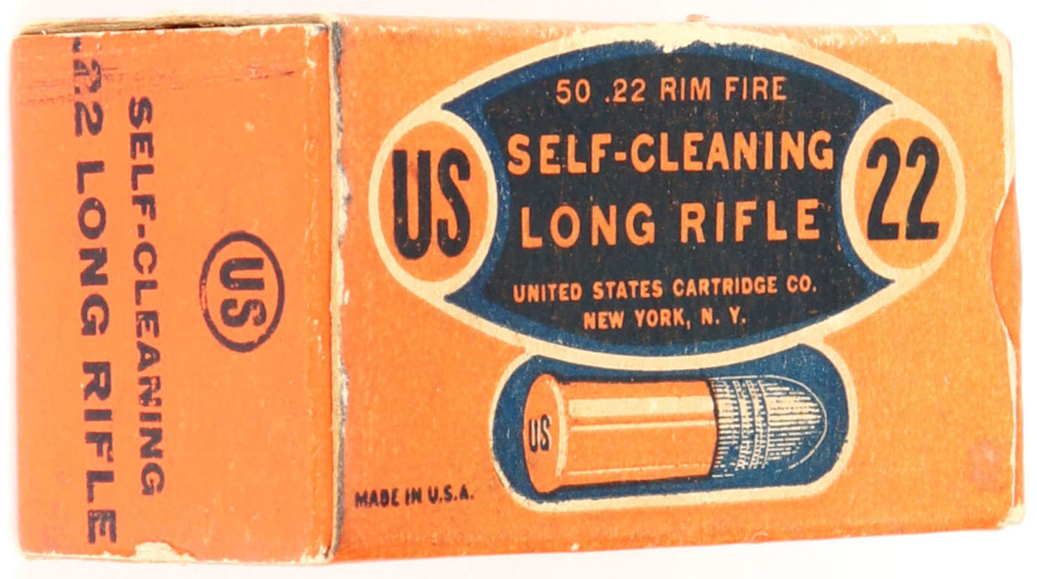 U.S., Self-Cleaning, .22 Long Rifle, RHWeb: US-10A LR-1a, Full, 1pc. Orange & black box, box is solid with excellent color, minor age soiling & corner wear, edges are crisp, end flaps are solid, ammo is very good. Grade: Very Good ++ - Value: 50 to 75