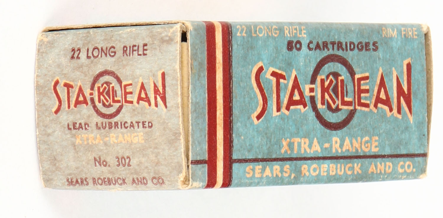 Sears, Sta-Klean, .22 Long Rifle, Xtra-Range, RHWeb: SEARS-6 LR-3, Full, 1pc. Blue white & maroon box, box is solid with very good color, some age soiling, very minor corner wear, edges are crisp, end flaps are solid, ammo is excellent. Grade: Excellent - Value: 16 to 24