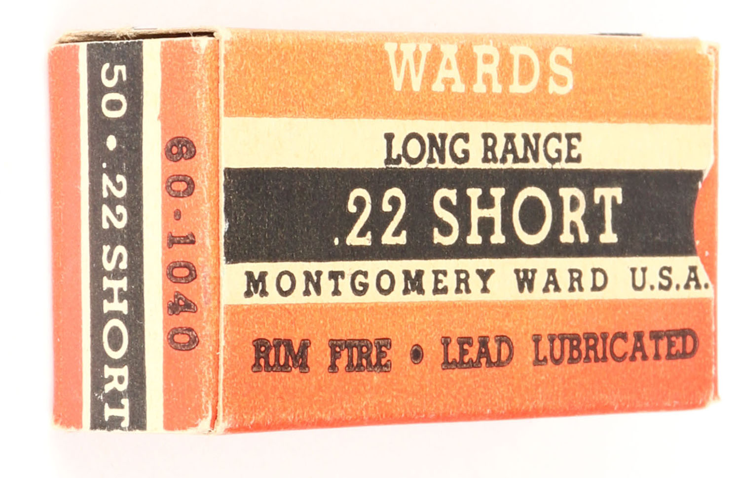 Wards, Long Range Cleanfire, .22 Short, Lead Lubricated, RHWeb: MW-4B S-1e, Partial 49rds., 1pc. Red black & white box, box is solid with very good color, some color fading on top, very minor corner wear, edges are crisp, end flaps are solid, ammo is excellent. Grade: Excellent + - Value: 14 to 22