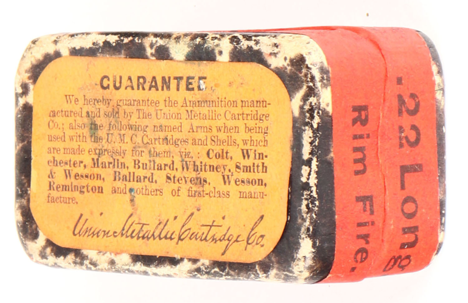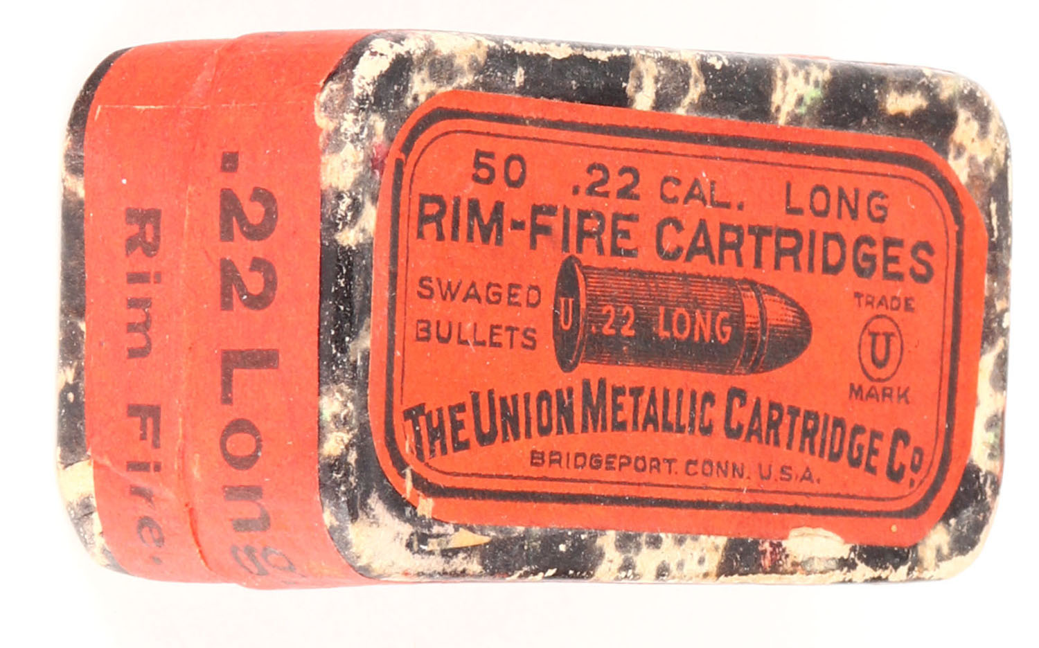 UMC, Rim-Fire Cartridges, .22 Long, Swaged Bullets, RHWeb: UMC-8 L-1b, FULL & SEALED, 2pc. Black mottled box with red top & side sealing labels, box is solid with excellent color, very minor edge & corner wear, labels are intact. Grade: Excellent - Value: 100 to 200