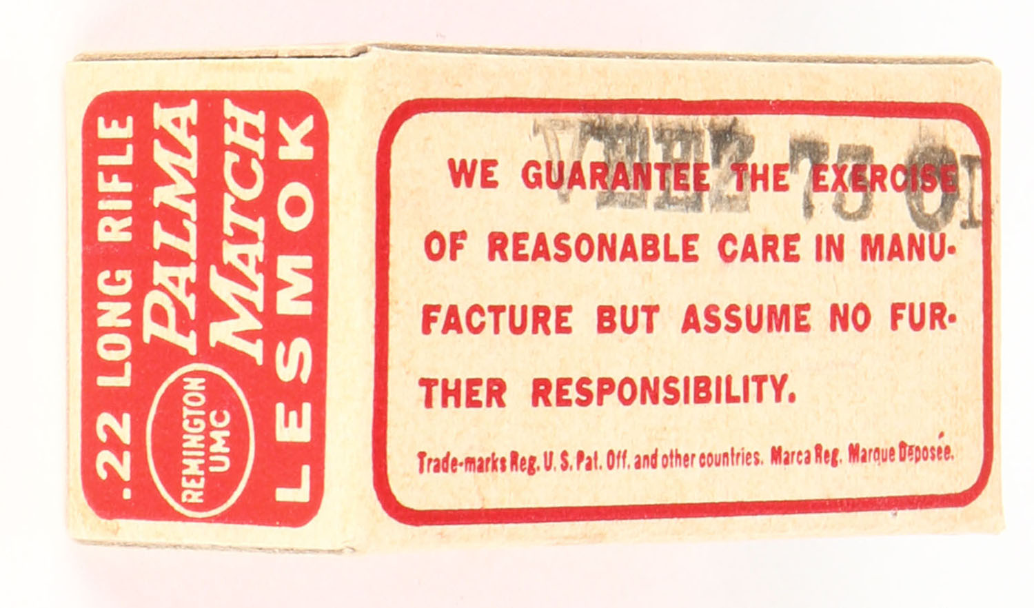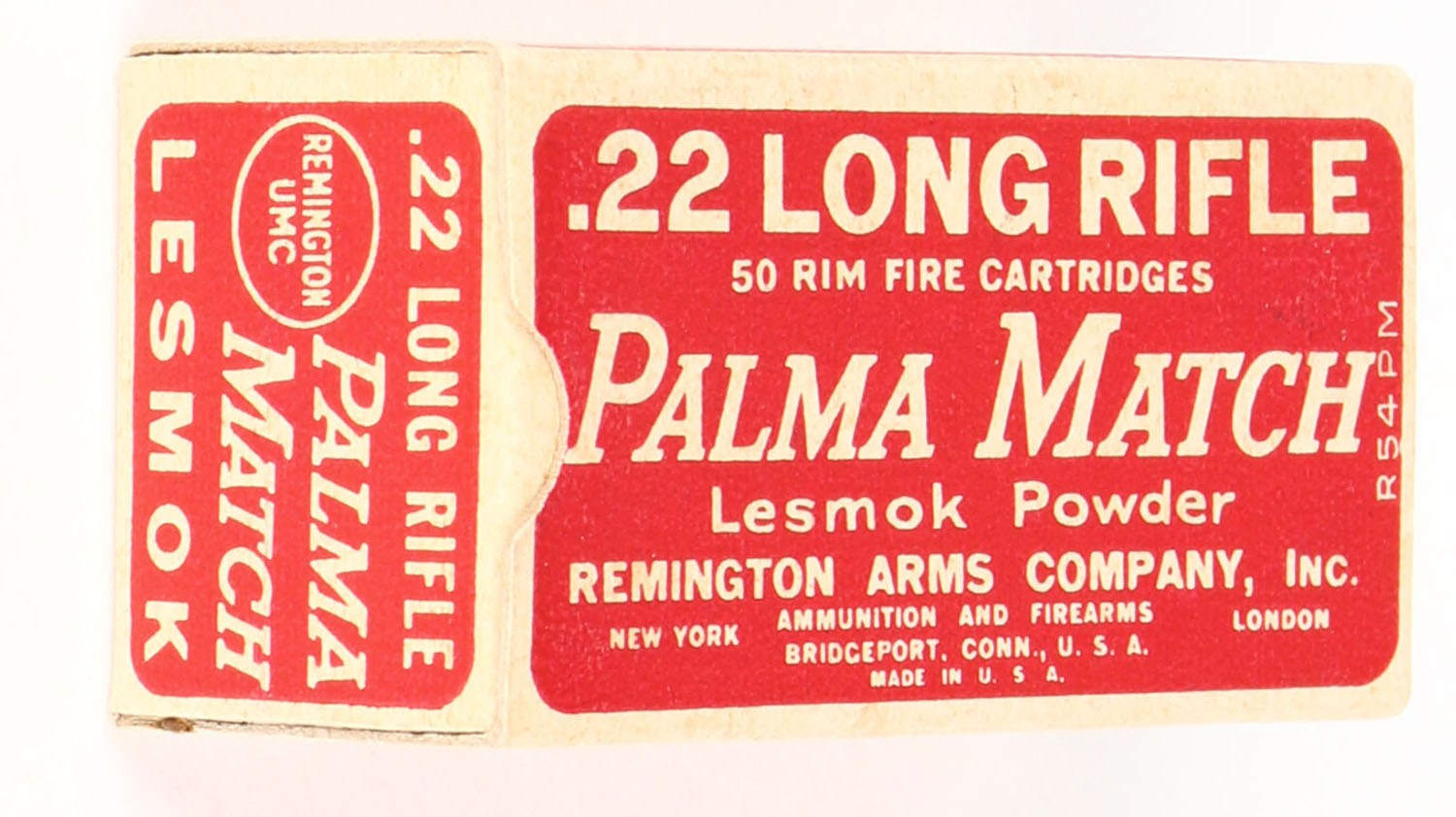 Remington, Palma Match, .22 Long Rifle, RHWeb: REM-52 LR-5d, Full, red & buff box, bottom stamped VEEX 73 OI, box is MINT with minty color, corners are sharp, edges are crisp, end flaps are solid, ammo is excellent. Grade: MINT - Value: 60 to 90