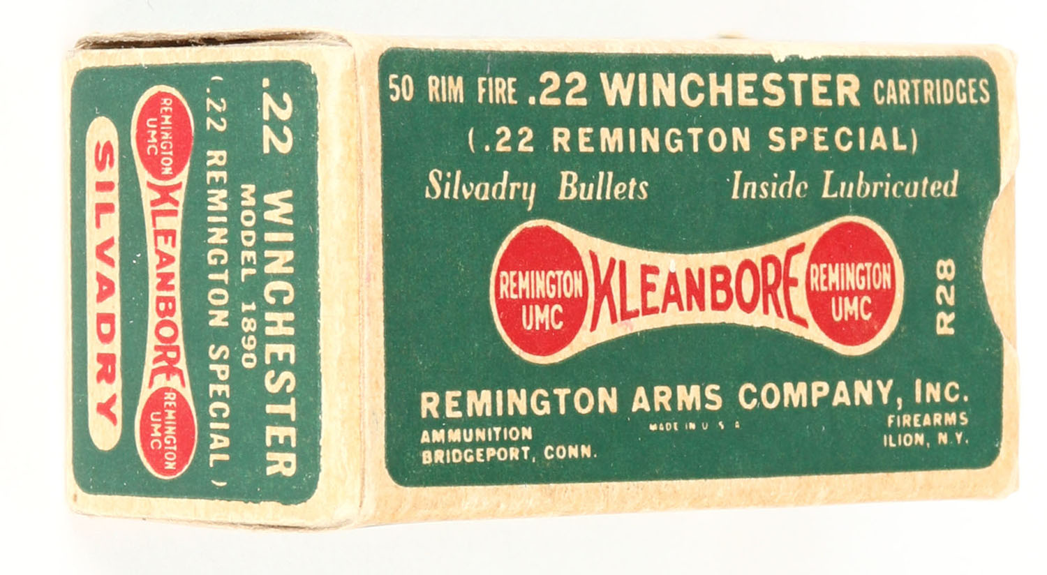 Winchester, Silvadry Kleanbore, .22 Winchester Rim Fire (.22 Remington Special), Full, 1pc. Green buff & red dog bone box, box is solid with excellent color, very minor age soiling & corner wear, edges are mostly crisp, end flaps are solid, ammo is excellent. Grade: Excellent + - Value: 160 to 240