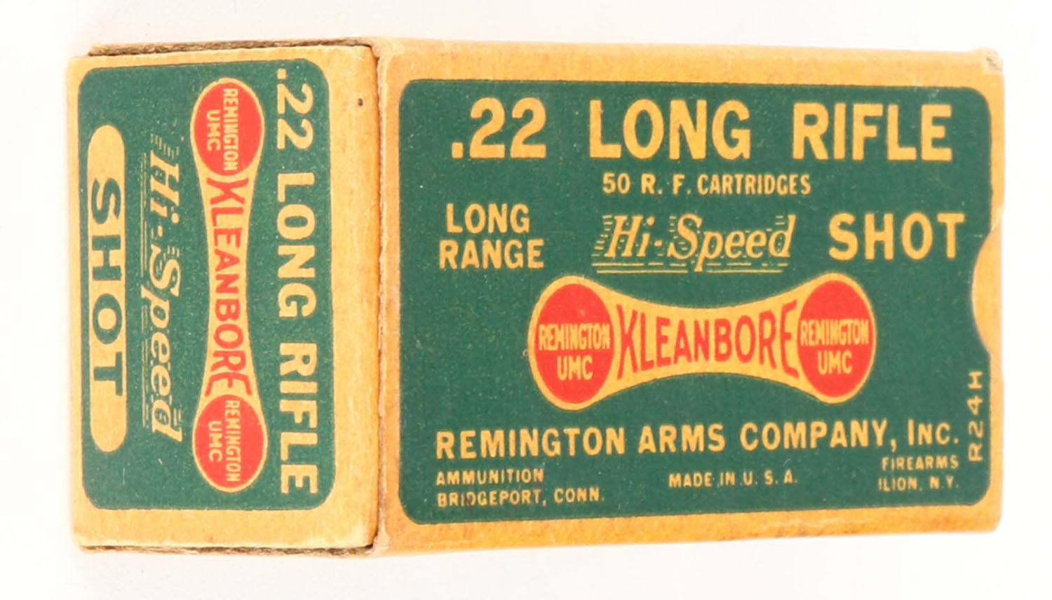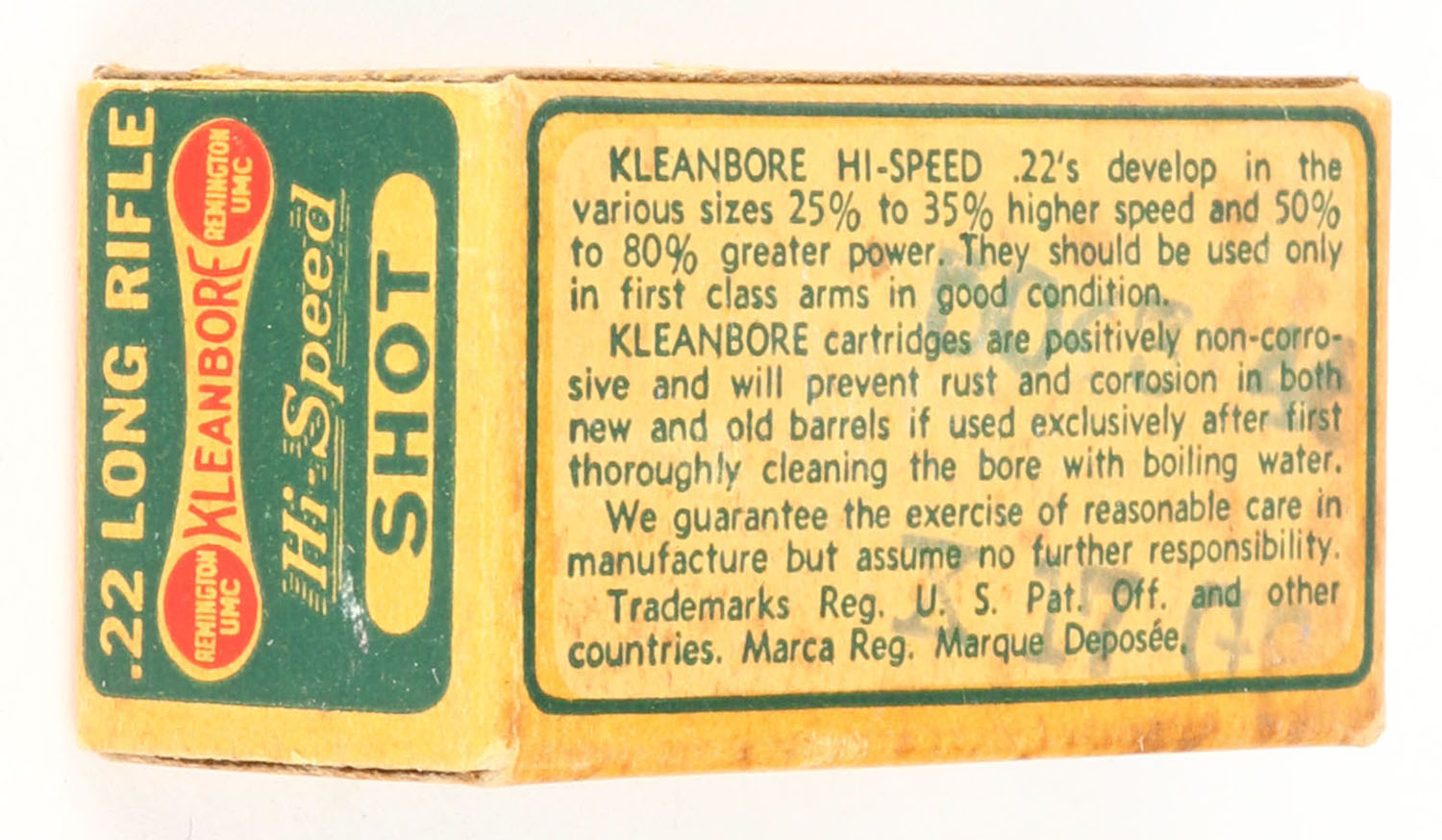 Remington, Hi-Speed Kleanbore, .22 Long Rifle Shot, RHWeb: REM-7.4 LR-4c, Full, 1pc. Green buff & red dog bone box, box is solid with excellent color, very minor corner wear, edges are crisp, end flaps are solid, ammo is excellent. Grade: Excellent ++ - Value: 30 to 45