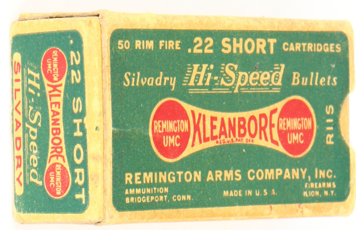 Remington, Silvadry Hi-Speed Kleanbore, .22 Short, RHWeb: REM-7.5 S-1c, Full, 1pc. Green buff & red dog bone box, box is solid with excellent color, minor age soiling, very minor edge & corner wear, end flaps are solid, ammo is excellent. Grade: Excellent - Value: 24 to 36