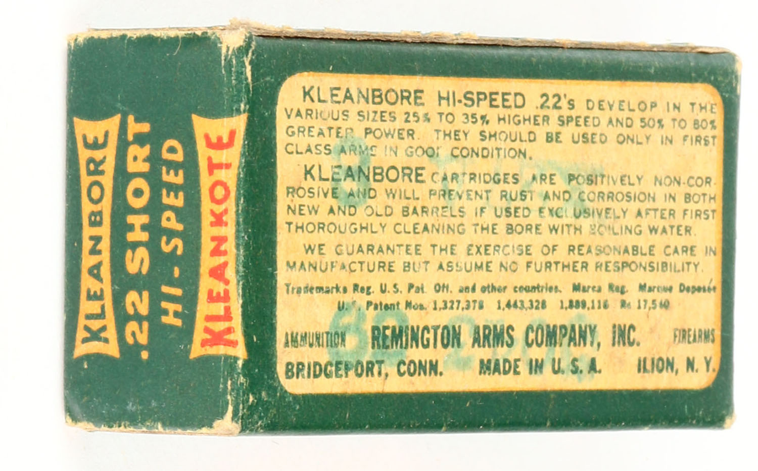Remington, Kleanbore Kleankote, .22 Short, Hi-Speed, RHWeb: REM-9 S-1b, Full, 1pc. Green buff & red box, box is solid with excellent color, minor age soiling, some corner wear, edges are crisp, end flaps are solid, ammo is very good. Grade: Excellent - Value: 20 to 30