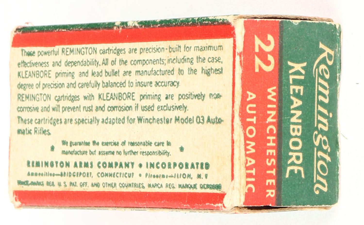 Remington, Kleanbore, .22 Winchester Automatic, RHWeb: REM-12 WA-1b, Partial 39rds., 1pc. Green white & red box, box is solid with excellent color, some edge & corner wear, end flaps are solid, ammo is excellent. Grade: Very Good ++ - Value: 20 to 30