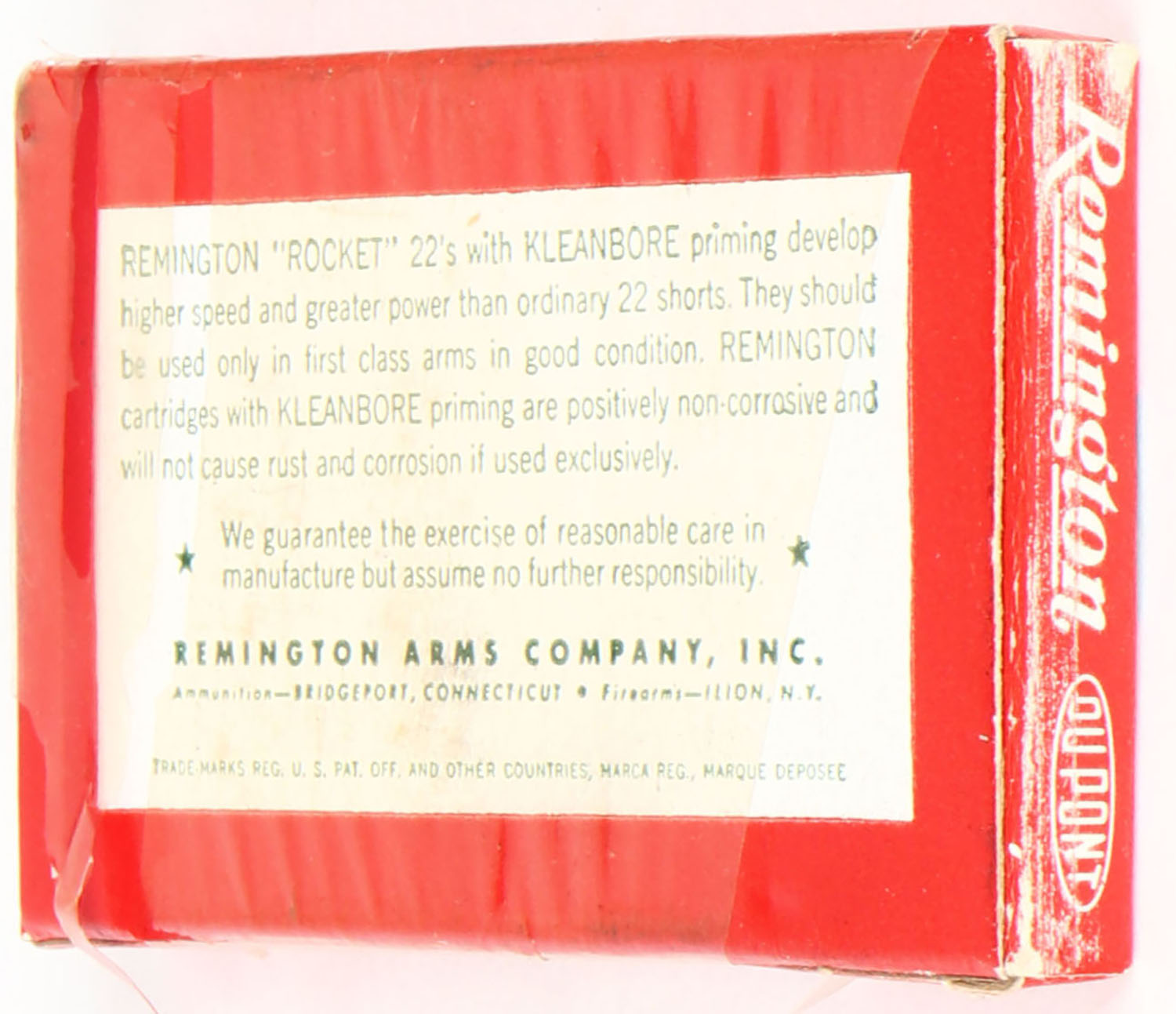 Remington, ''Rocket'', .22 Short, RHWeb: REM-14 S-5, Full, 1pc. Red white & green box, box is near mint with minty color, only very minor corner wear, edges are crisp, cellophane is 80% intact, ammo is mint. Grade: Excellent ++ - Value: 40 to 60