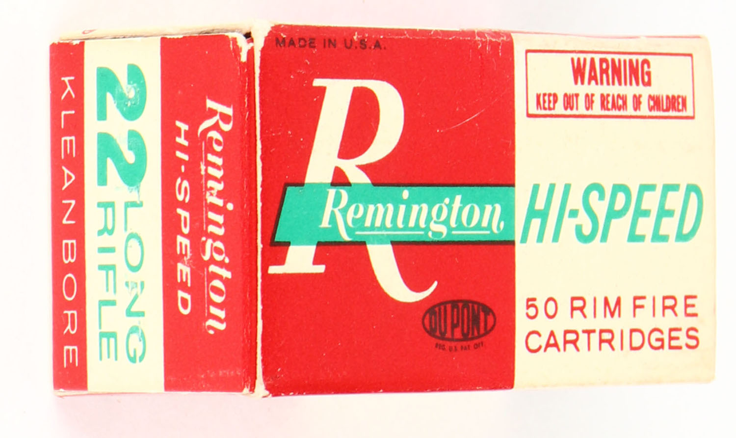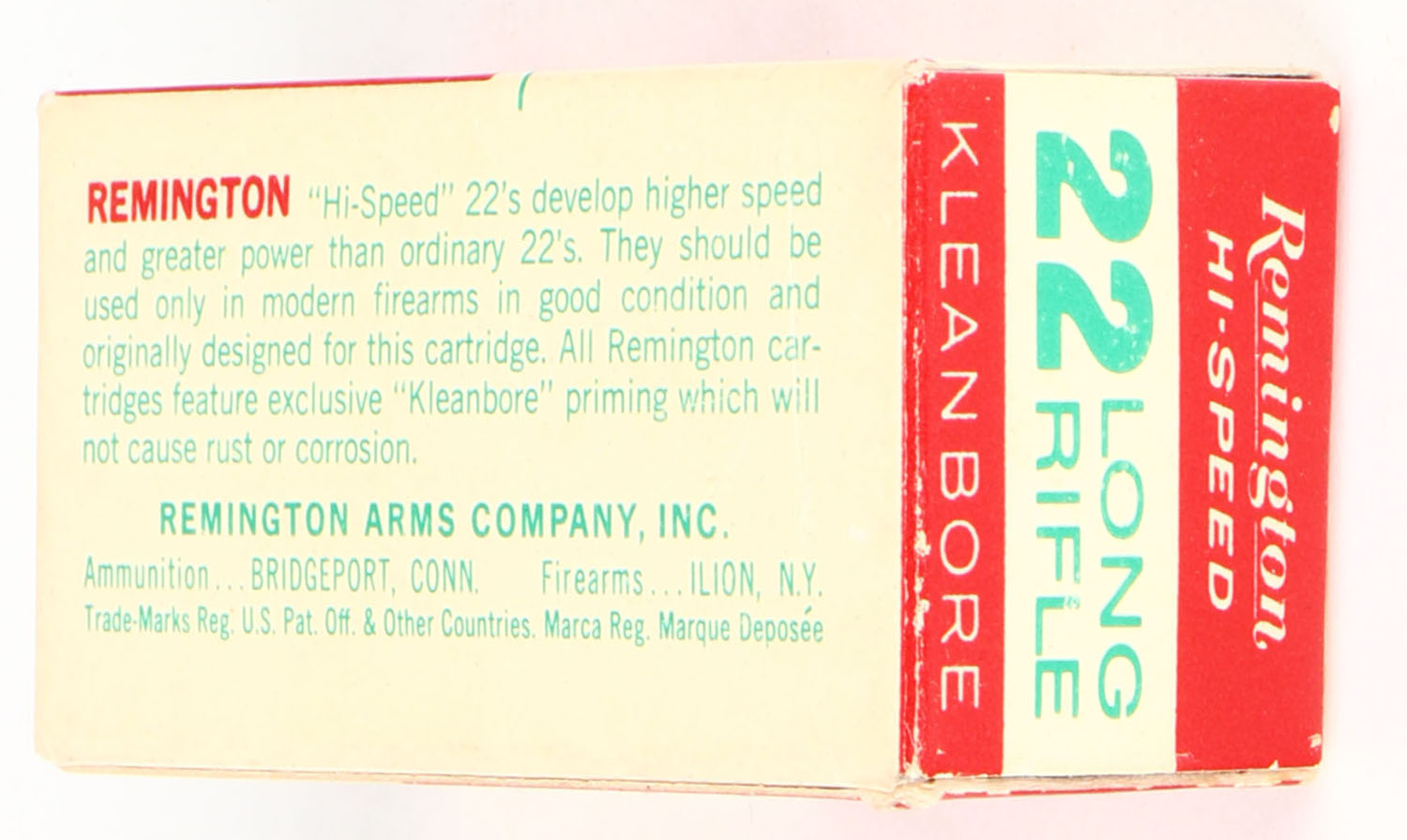 Remington, Hi-Speed, .22 Long Rifle, ''Golden'' Bullet, RHWeb: REM-17 LR-1a, Full, 1pc. Red white & green box, box is solid with excellent color, very minor age soiling & corner wear, edges are crisp, end flaps are solid, ammo is excellent. Grade: Excellent - Value: 10 to 15