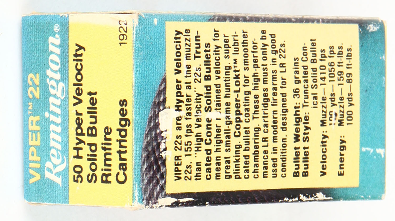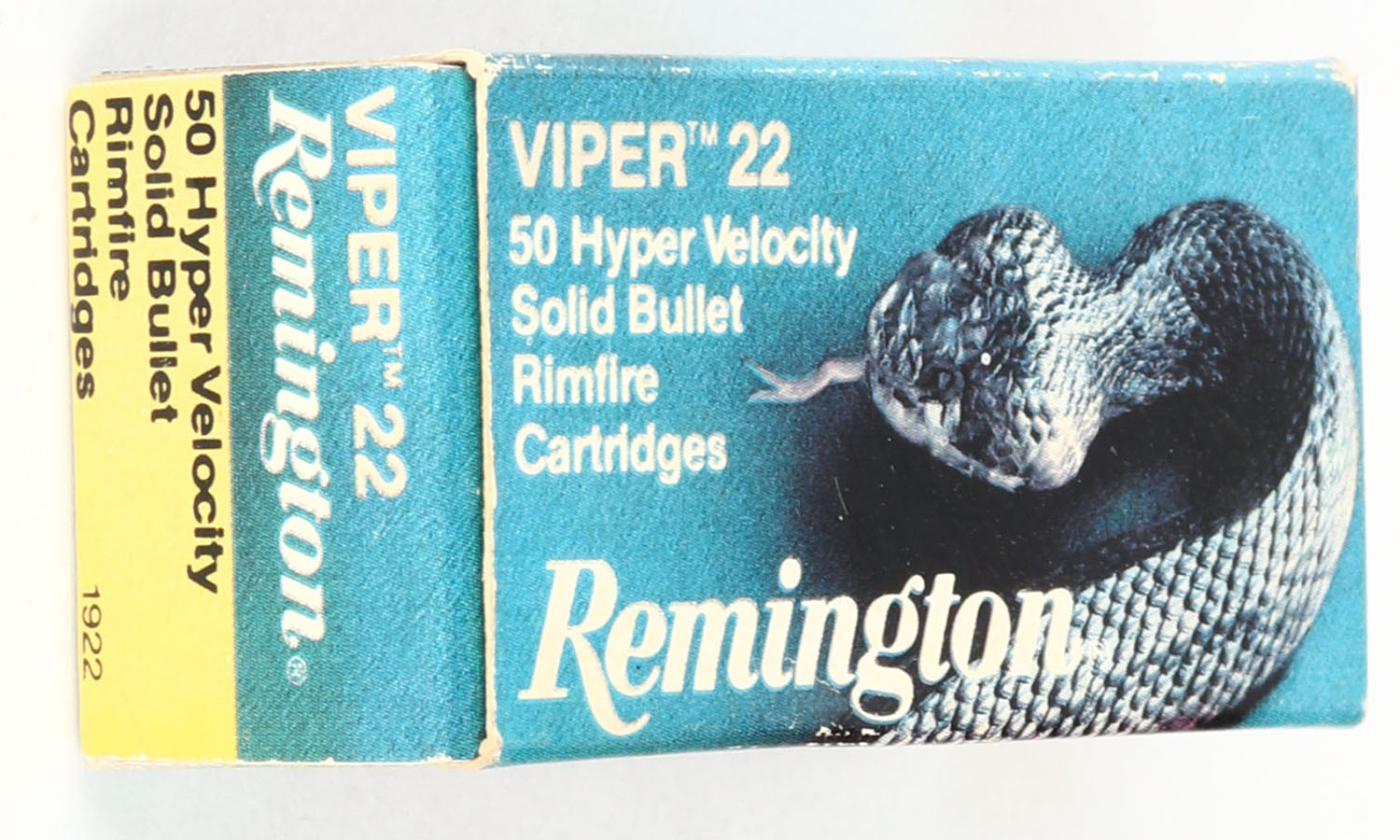 Remington, Viper 22, .22 Long Rifle, Hyper Velocity, RHWeb: REM-35 LR-1b, Full, 1pc. Green & white box, box is solid with very good color, some color fading, corners are mostly sharp, edges are crisp, end flaps are solid, ammo is minty. Grade: Excellent - Value: 8 to 12