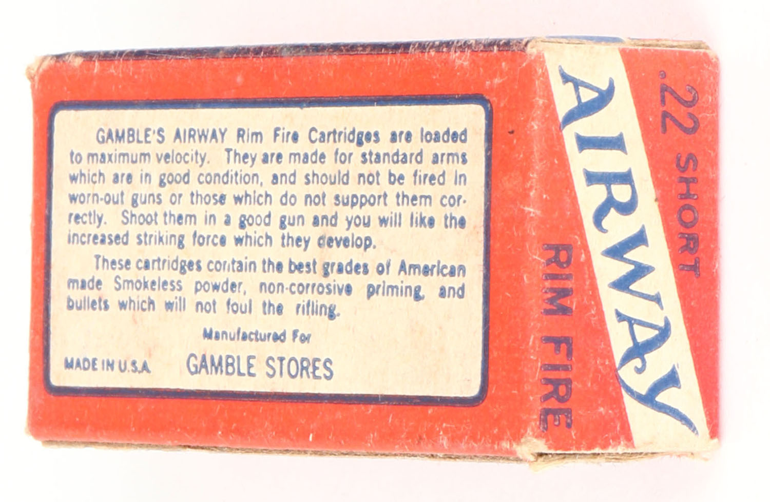 Gambles, Airway, .22 Short, RHWeb: GS-1 S-1c, Full, 1pc. Red blue & white box, box is solid with excellent color, minor age soiling & corner wear, very minor edge wear, end flaps are solid, ammo is excellent. Grade: Very Good ++ - Value: 40 to 60