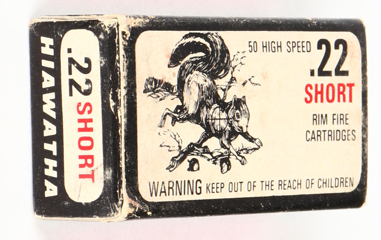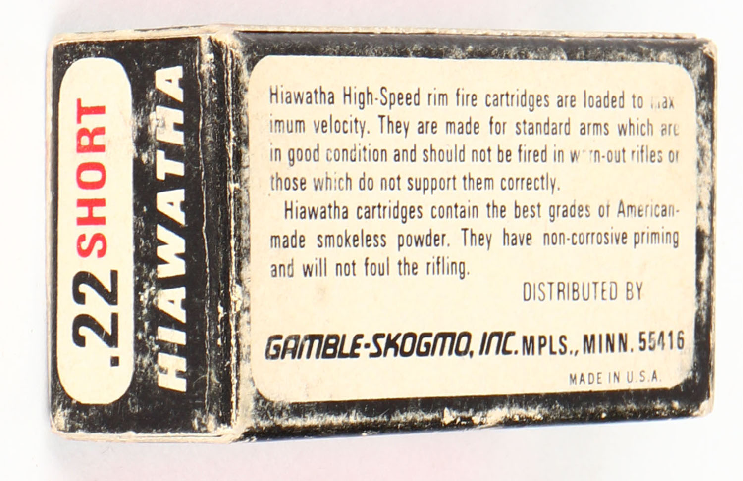 Gambles, Hiawatha, .22 Short, High Speed, RHWeb: GS-5 S-1a, Full, 1pc. Black white & red box, box is solid with very good to excellent color, some age soiling & corner wear, edges are mostly crisp, end flaps are solid, ammo is excellent to minty. Grade: Very Good ++ - Value: 50 to 75