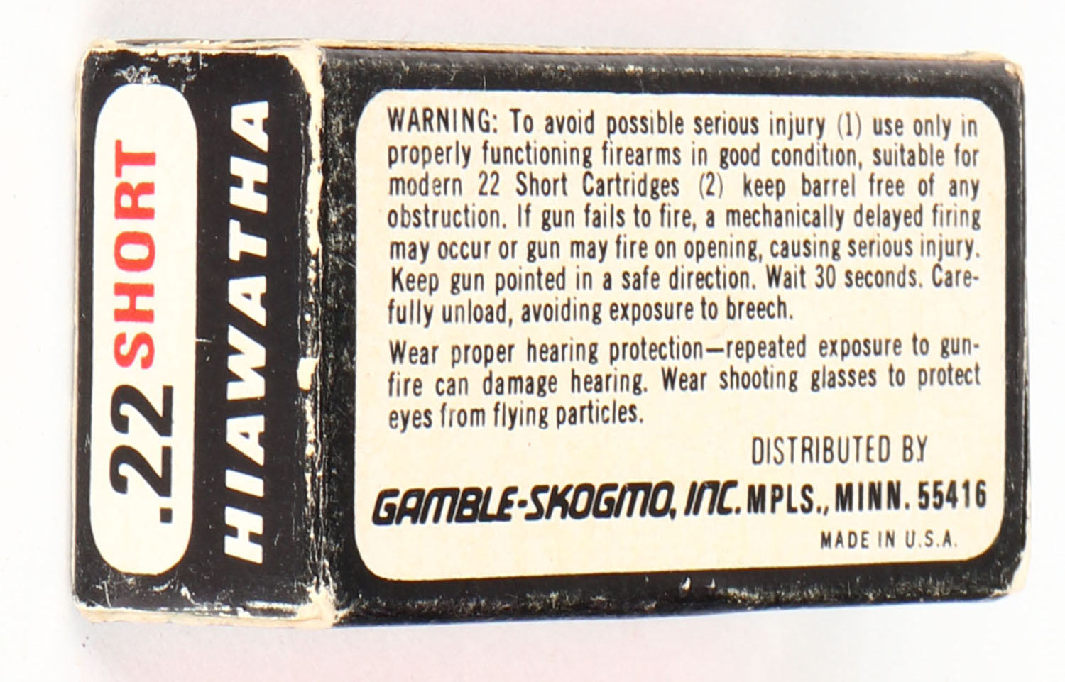 Gambles, Hiawatha, .22 Short, High Speed, RHWeb: GS-5 S-1a, Full, 1pc. Black white & red box, box is solid with excellent color, sticker stain on top, very minor corner wear, edges are mostly crisp, end flaps are solid, ammo is excellent. Grade: Excellent - Value: 50 to 75