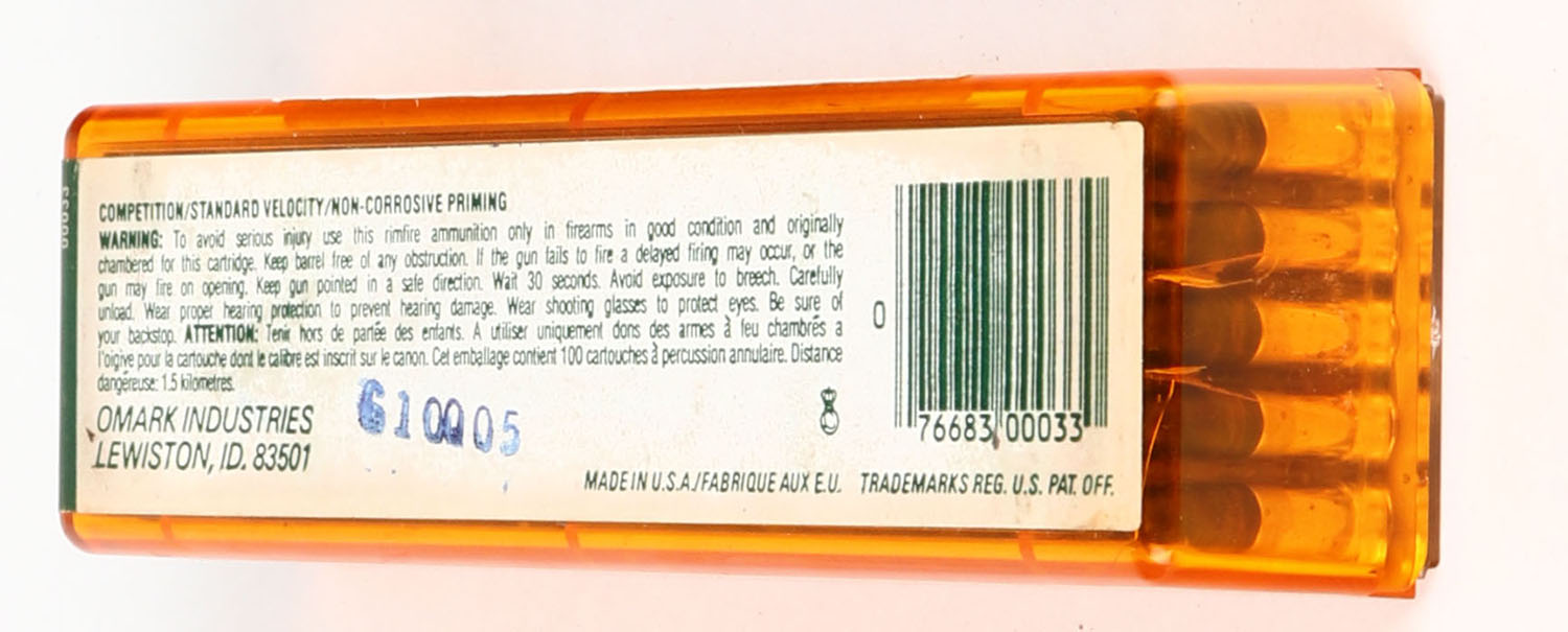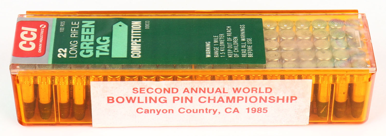 CCi, Green Tag Competition, .22 Long Rifle, RHWeb: CCI-6.1 LR-4a, FULL & SEALED, 2pc. Amber plastic tray with green sealing label & white 'Second Annual World Bowling Pin Championship' label on side, box is near mint with minty color, only some cloudiness to plastic tray lid, ammo appears minty. Grade: Excellent + - Value: 16 to 24