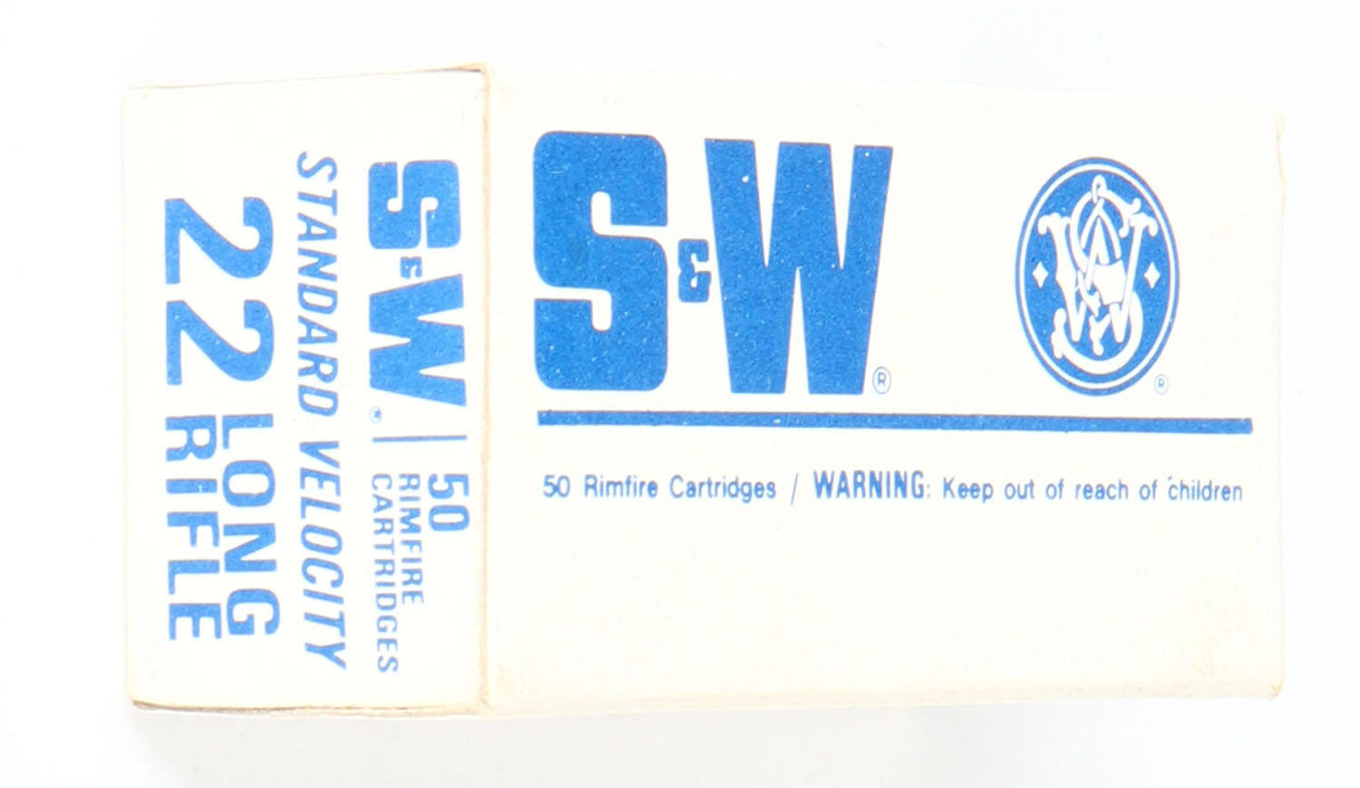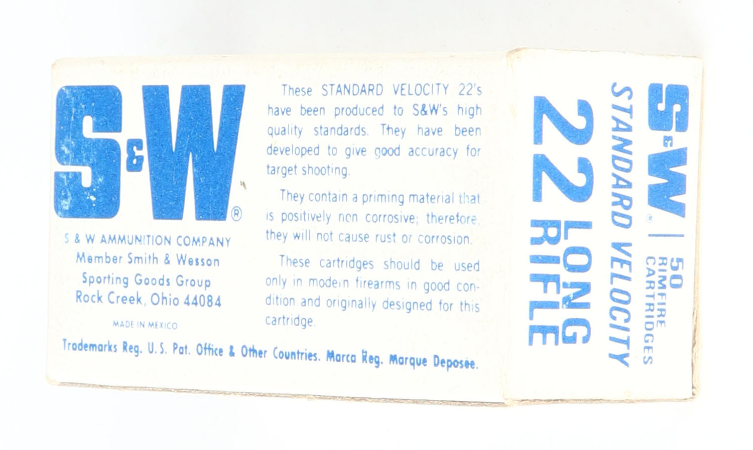 Smith & Wesson, .22 Long Rifle, Standard Velocity, RHWeb: S&W-2 LR-2a, Full, 1pc. White & blue box, box is near mint with excellent color, only very minor age soiling, corners are sharp, edges are crisp, end flaps are solid, ammo is minty. Grade: Excellent ++ - Value: 10 to 15