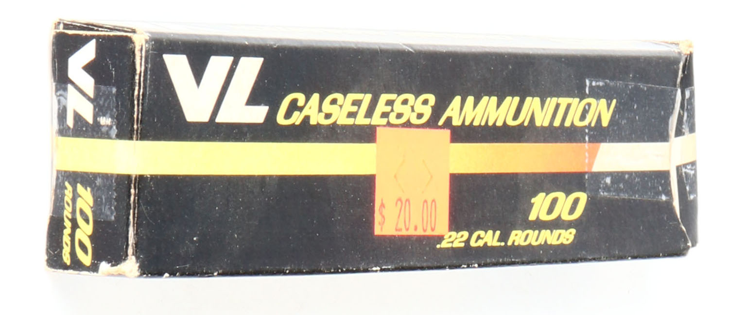 Daisy & Heddon, VL Caseless Ammunition, .22 Caliber, not in RHWeb, Full, 1pc. Black yellow & white box, box is solid with excellent color, tape on left end, some corner wear, very minor edge wear, end flaps are solid, ammo is excellent. Grade: Excellent - Value: 12 to 18