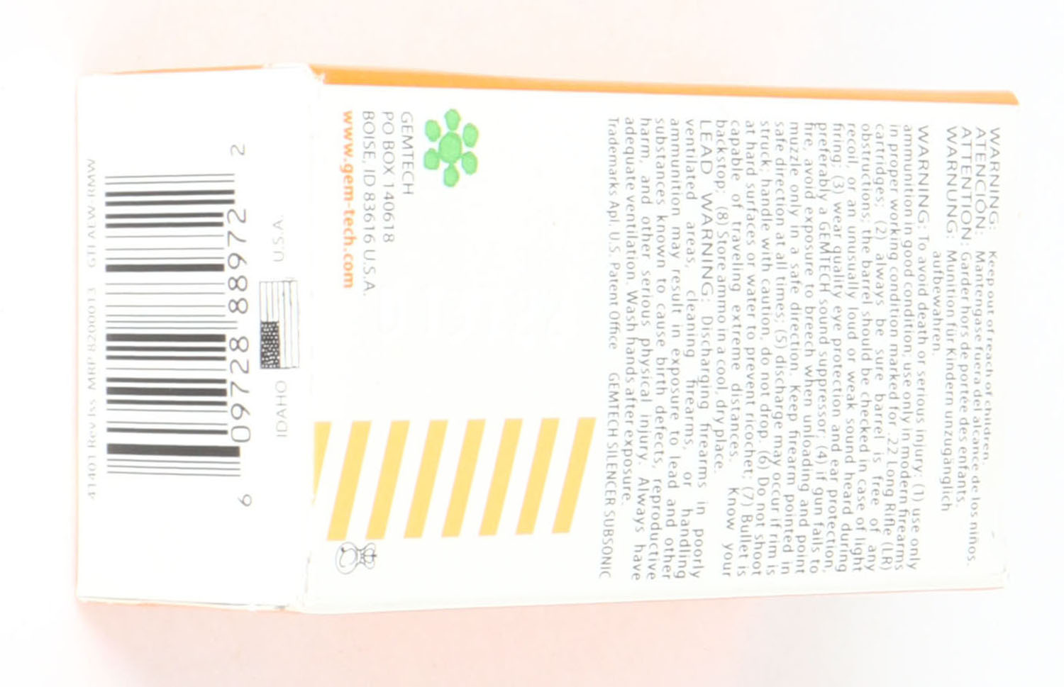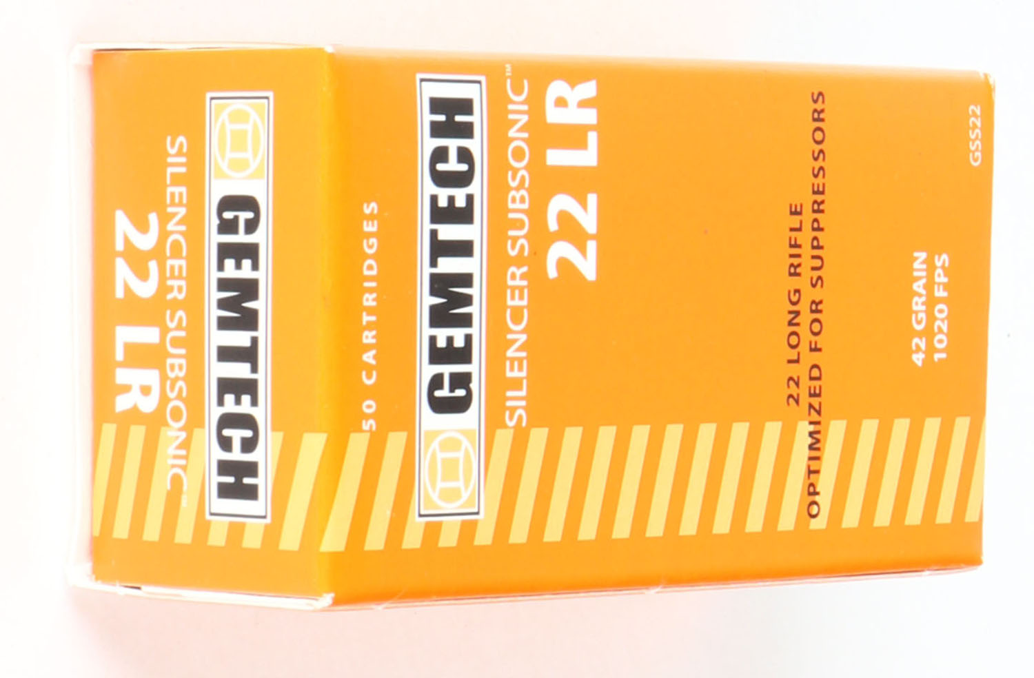 Gemtech, Silencer Subsonic .22 Long Rifle, 42 Grain Lead Round Nose, 1020 FPS, RHWeb: GEMT-1 LR-1, Full, 1pc. Orange white & black box, box is MINT with minty color, corners are sharp, edges are crisp, end flaps are solid, ammo is minty. Grade: MINT - Value: 8 to 12