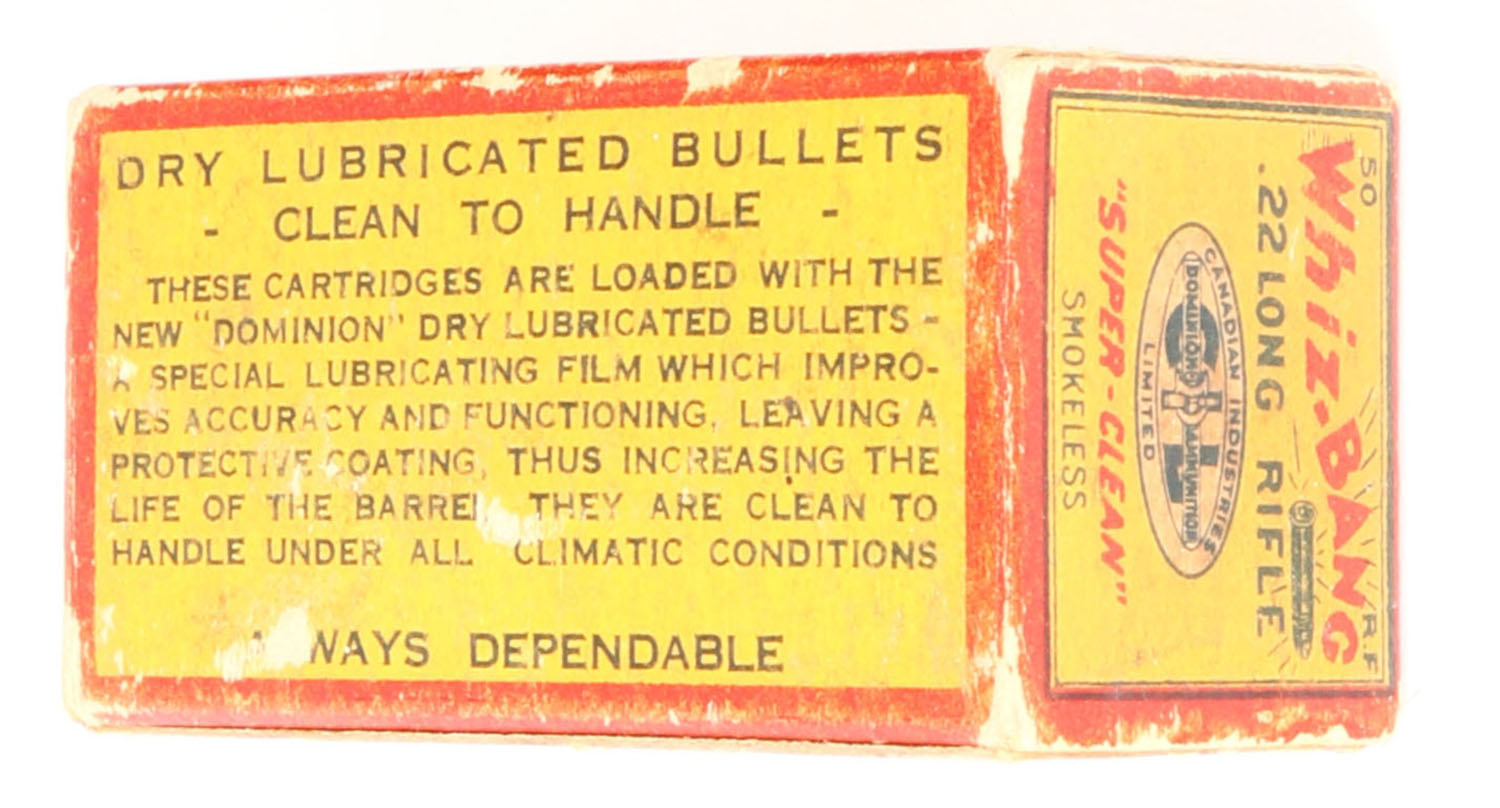 C.I.L., Whiz-Bang, .22 Long Rifle, Dry Lubricated Bullets, RHWeb: (Canada) CIL-2 LR-6, Full, 1pc. Red yellow & blue box, box is solid with very good to excellent color, some age soiling & corner wear, minor edge wear, end flaps are solid, ammo is excellent. Grade: Very Good ++ - Value: 50 to 75
