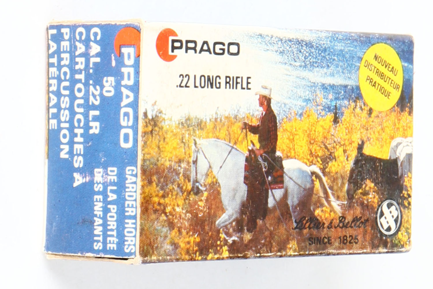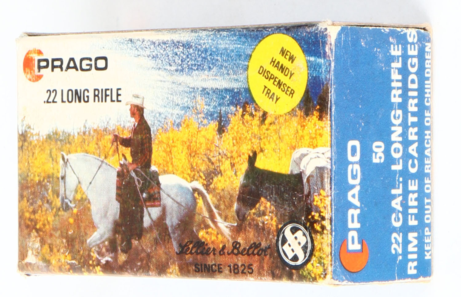 Sellier & Bellot, Prago, .22 Long Rifle, RHWeb: (Czechoslovakia) MISC-1 LR-2, Full, 1pc. Multi-colored box, box is solid with excellent to minty color, very minor edge & corner wear, end flaps are solid, ammo is excellent. Grade: Excellent ++ - Value: 50 to 75