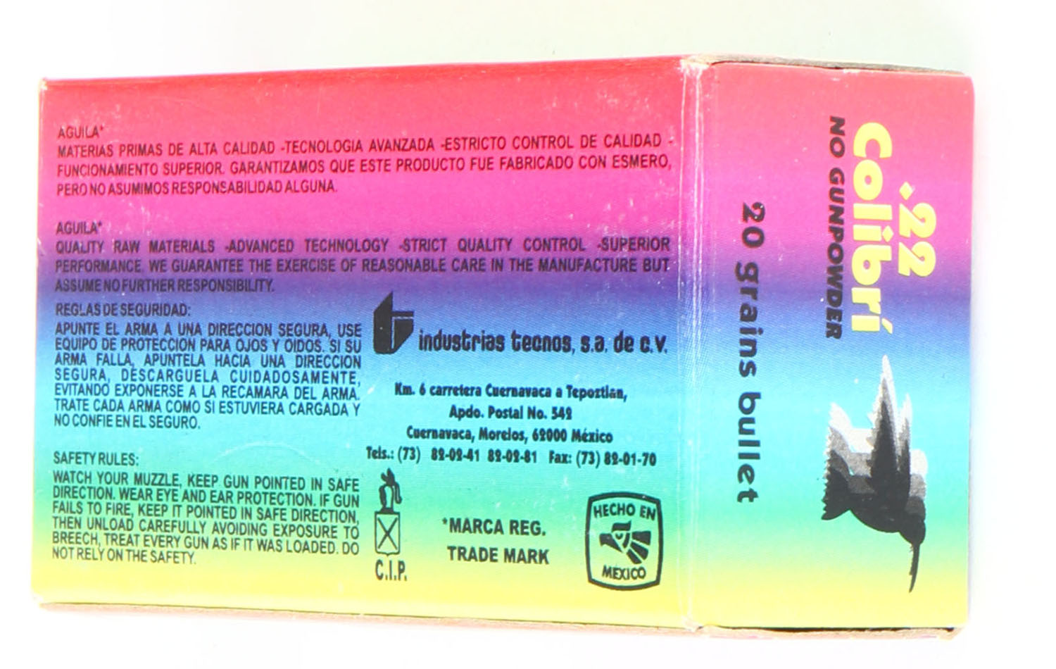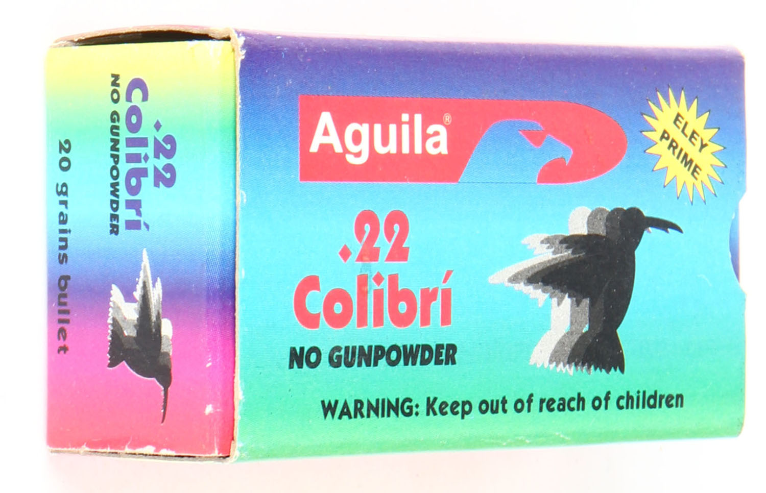 Aguila, .22 Colibri, .22 Long, Powderless Cartridges, RHWeb: (Mexico) IT-7 L-3. Full, 1pc. Multi-colored box, box is MINT with minty color, corners are sharp, edges are crisp, end flaps are solid, ammo is minty. Grade: MINT - Value: 10 to 15