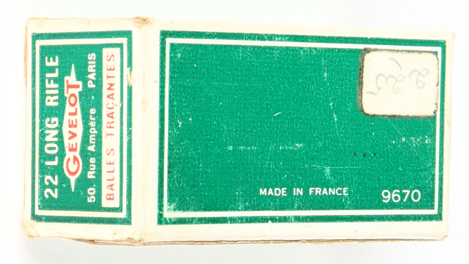 Gevelot, Balles Tracantes, .22 Long Rifle (Tracers), RHWeb: (France) G-6 LR-2, Full, 1pc. Green white & red box, box is solid with minty color, minor corner wear, very minor edge wear, end flaps are solid, ammo is excellent. Grade: Excellent + - Value: 30 to 45