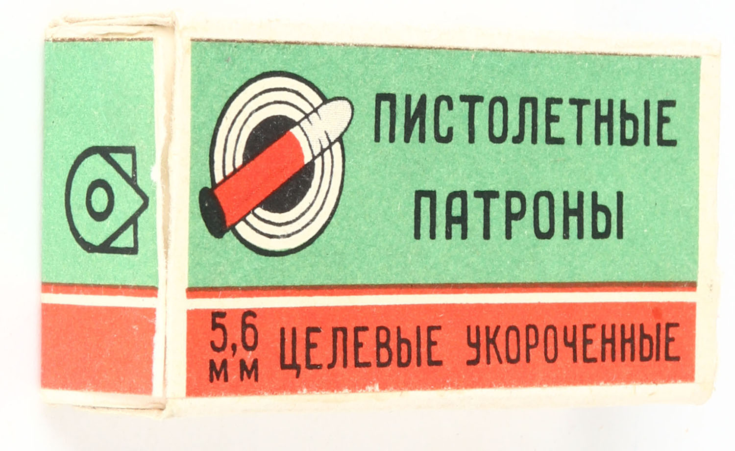 Unknown Mfg., Pistol Cartridges, .22 Short, Short Target, Non-Rusting, RHWeb: (USSR) NAT-1 S-2, Full, 1pc. Green red & white box, box is solid with excellent color, minor age soiling, very minor corner wear, label has started to peel on left end, edges are crisp, end flaps are solid, ammo is excellent. Grade: Excellent + - Value: 20 to 30