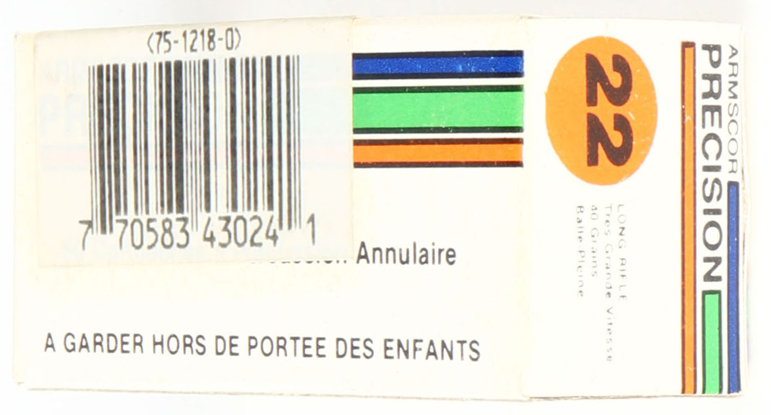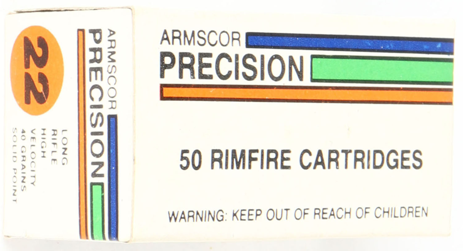 Armscor, Precision, .22 Long Rifle, 40 Grain Solid Point, RHWeb: (Canada) RUKO-2 LR-2, Full, 1pc. White box, box is MINT with minty color, corners are sharp, edges are crisp, end flaps are solid, ammo is mint. Grade: MINT - Value: 10 to 15