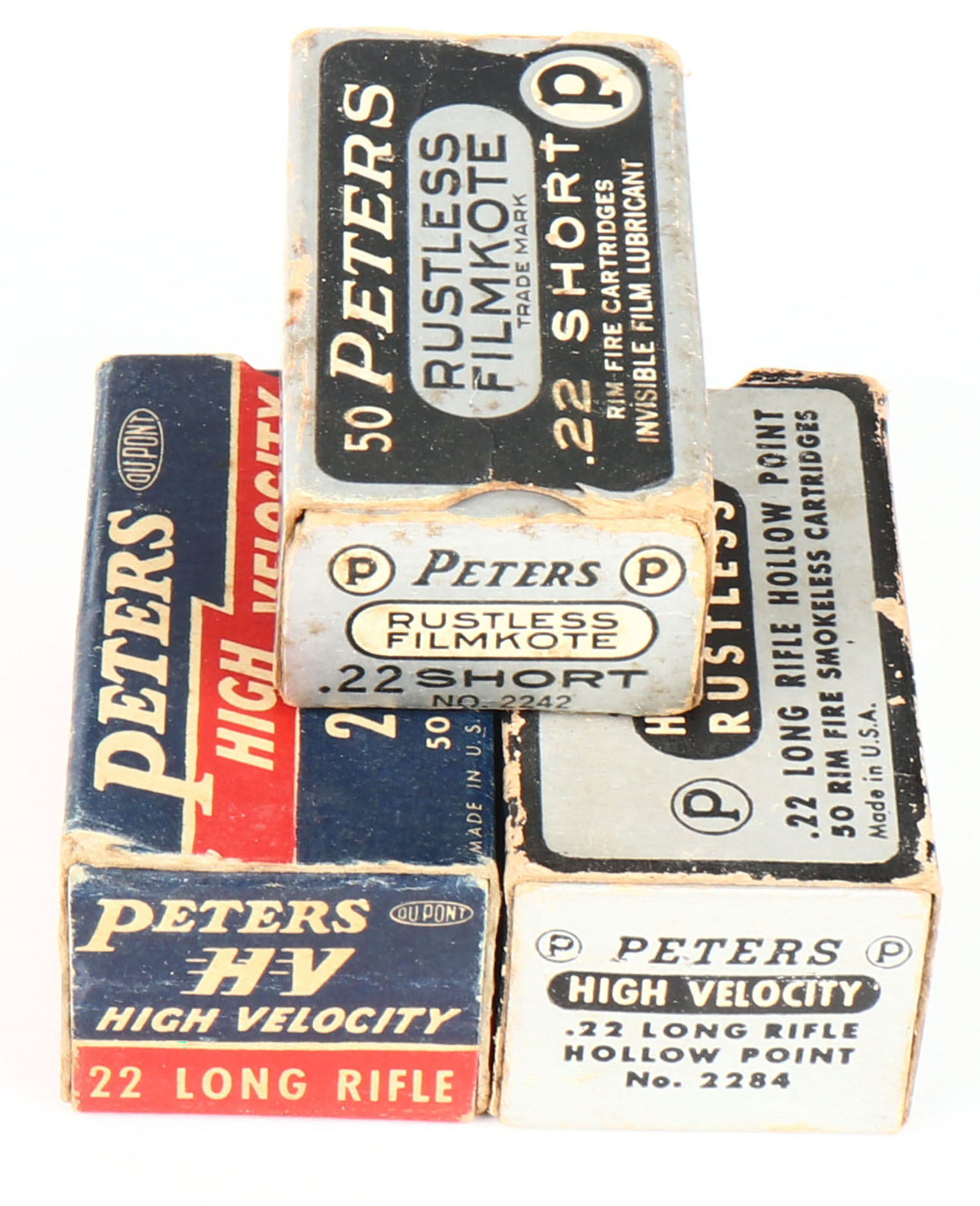 Peters, lot of (3) boxes, (2) boxes appear full, Rustless Filmkote box is partial 27rds.. Grade: Excellent - Value: 30 to 45