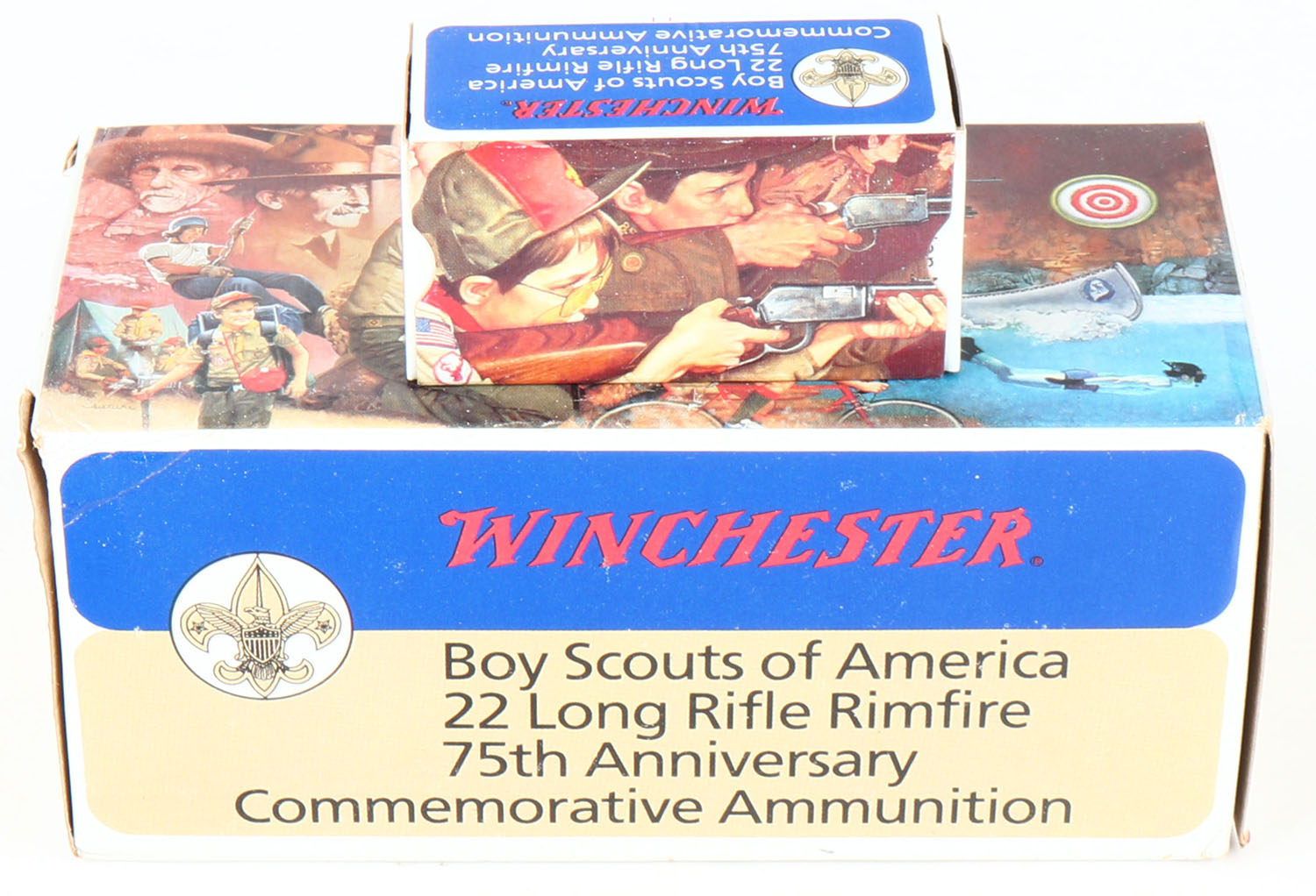 Winchester, Boy Scouts of America 75th Anniversary, .22 Long Rifle, High Velocity, 1pc., Full 500rds. brick, multi colored picture of Boy Scouts, great full color image, brick is solid with excellent to minty color, minor corner wear, edges are crisp, end flaps are solid, inside boxes are minty. Grade: Excellent + - Value: 200 to 300