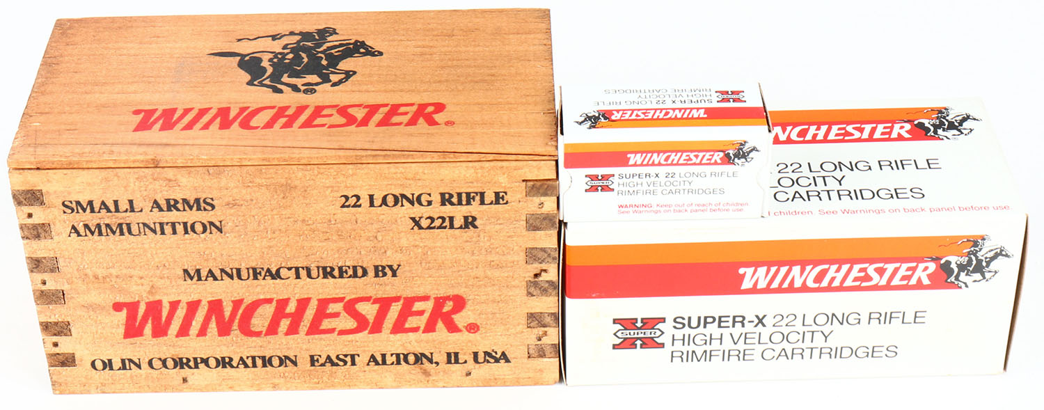 Winchester, Super-X, .22 Long Rifle, High Velocity, Full, 500rds. 1pc. White red & orange brick inside a wood box, wood box is solid with minty color, small crack on lid, brick is mint with minty color, inside boxes are mint. Grade: Excellent ++ - Value: 70 to 100