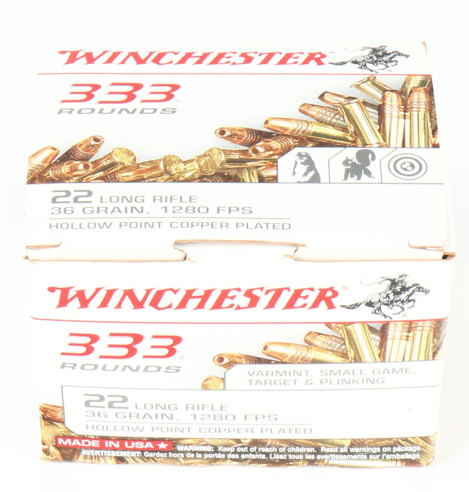 Winchester, .22 Long Rifle, 36 Grain Copper Plated Hollow Point, 1280 FPS, Full, 333rds. 1pc. White bulk box, box is solid with minty color, very minor corner wear, edges are crisp, top flap is solid, ammo is minty. Grade: Excellent ++ - Value: 20 to 30