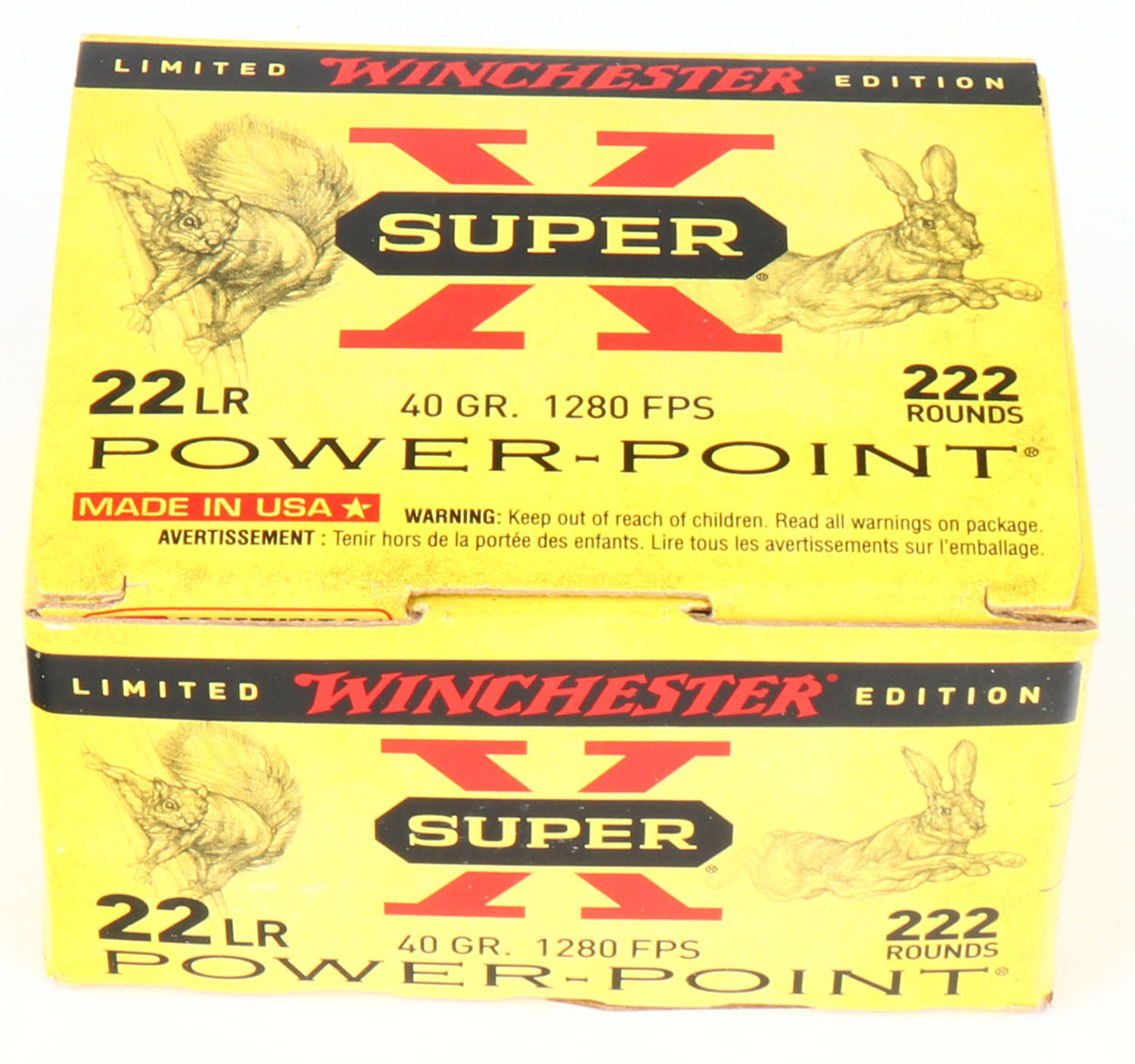 Winchester, Super-X Power-Point, .22 Long Rifle, 40 Grain Bullet, 1280 FPS, Full, 222rds., 1pc. Yellow black & red bulk box, box is MINT with minty color, corners are sharp, edges are crisp, top flap is solid, ammo is minty. Grade: MINT - Value: 16 to 24