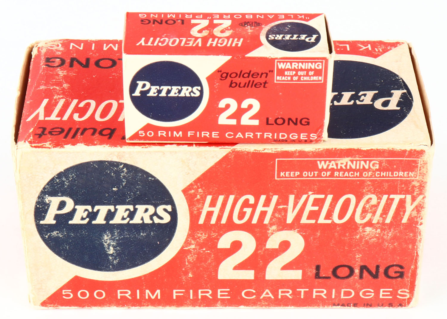 Peters, High Velocity, .22 Long, ''golden'' bullet, Full, 500rds. 1pc. Red white & blue brick, brick is solid with very good color, minor age soiling, shelf wear, edge & corner wear, end flaps are solid, inside boxes are excellent. Grade: Very Good - Value: 80 to 120