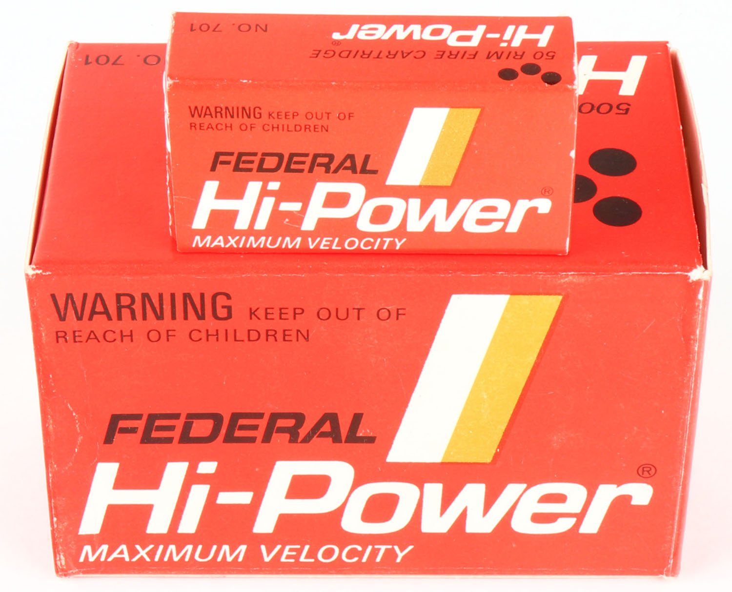 Federal, Hi-Power, .22 Short, No. 701, Full, 500rds. 1pc. Red white & black box, box is near mint with minty color, only very minor corner wear, edges are crisp, end flaps are solid, inside boxes are minty. Grade: Excellent ++ - Value: 60 to 90