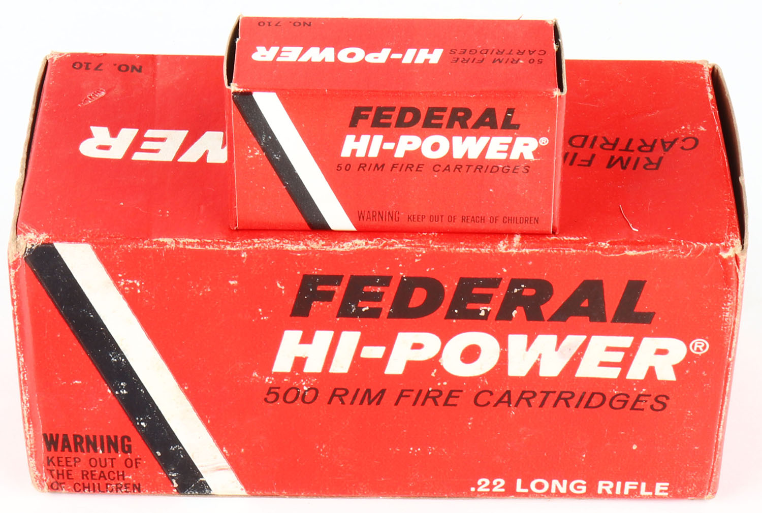 Federal, Hi-Power, .22 Long Rifle, No. 710, Full, 1pc. Red black & white brick, brick is solid with excellent color, some shelf & corner wear, some edge wear, end flaps are solid, inside boxes are excellent to minty. Grade: Excellent - Value: 40 to 60