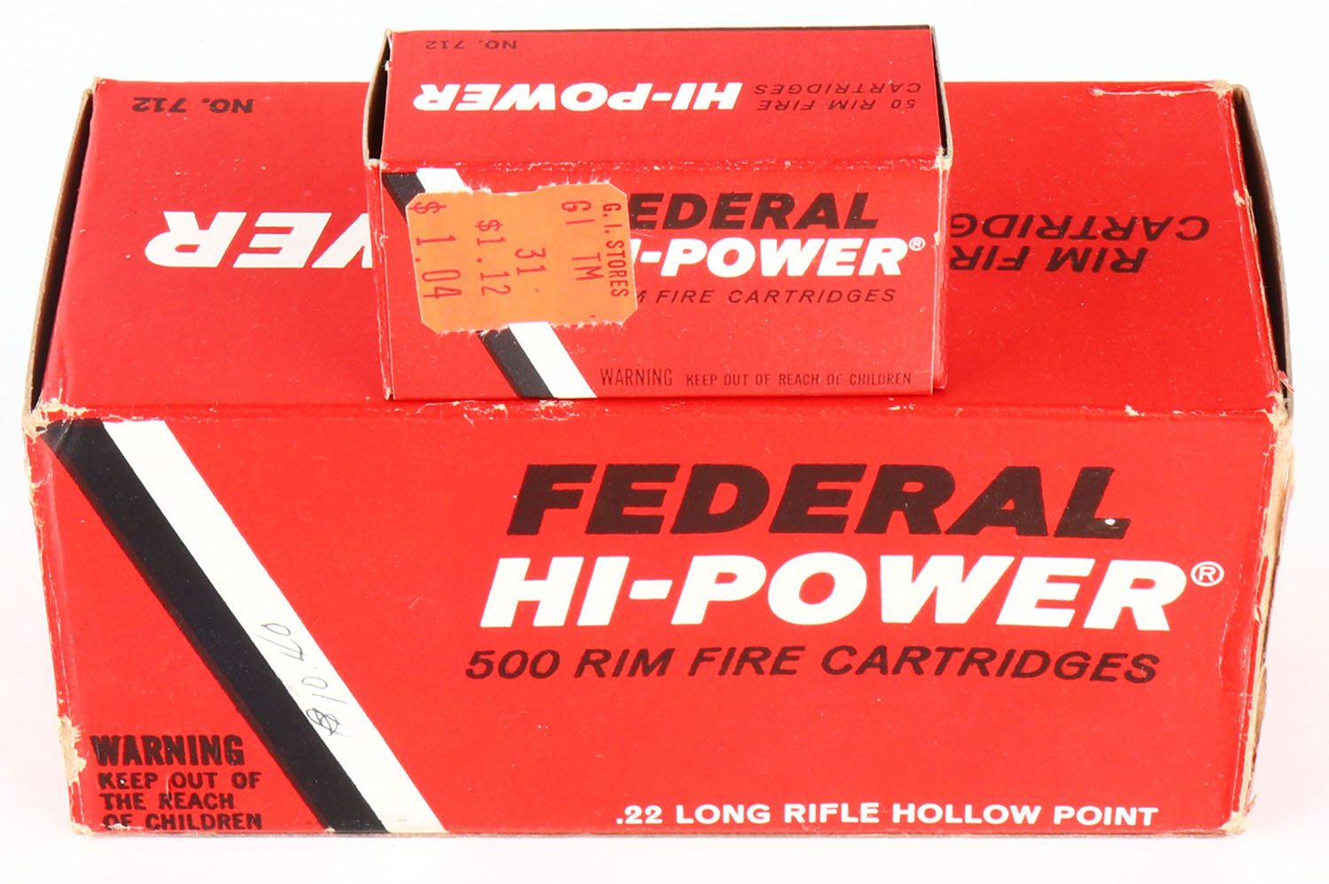Federal, Hi-Power, .22 Long Rifle Hollow Point, No. 712, Full, 500rds. 1pc. Red black & white brick, brick is solid with excellent color, top has been written on, some corner wear, very minor edge wear, end flaps are solid, inside boxes are minty. Grade: Excellent - Value: 50 to 75