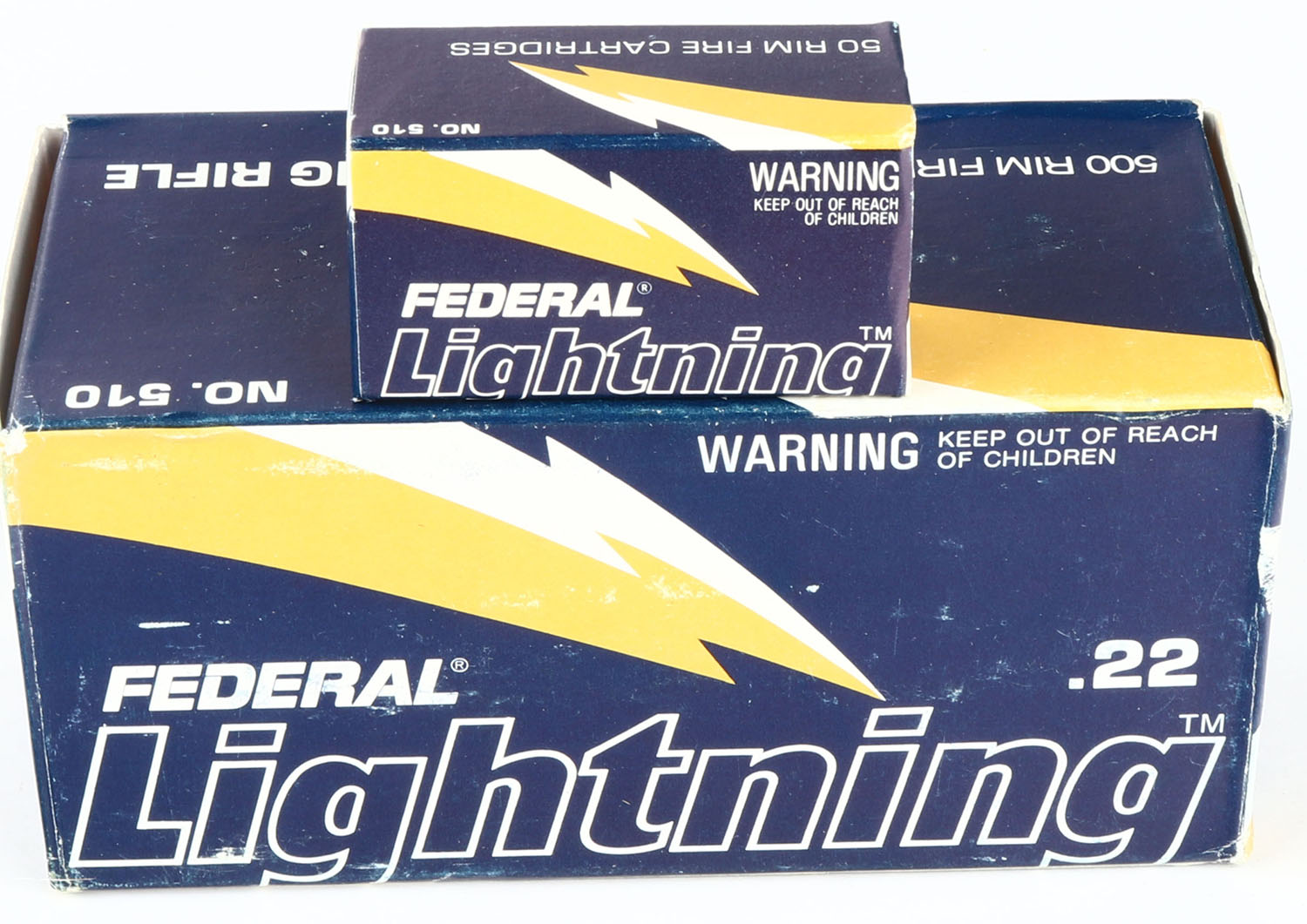 Federal, Lightning, .22 Long Rifle, Full, 500rds. 1pc. Blue white & gold brick, brick is solid with minty color, minor corner wear, edges are crisp, end flaps are solid, inside boxes are minty. Grade: Excellent + - Value: 36 to 54