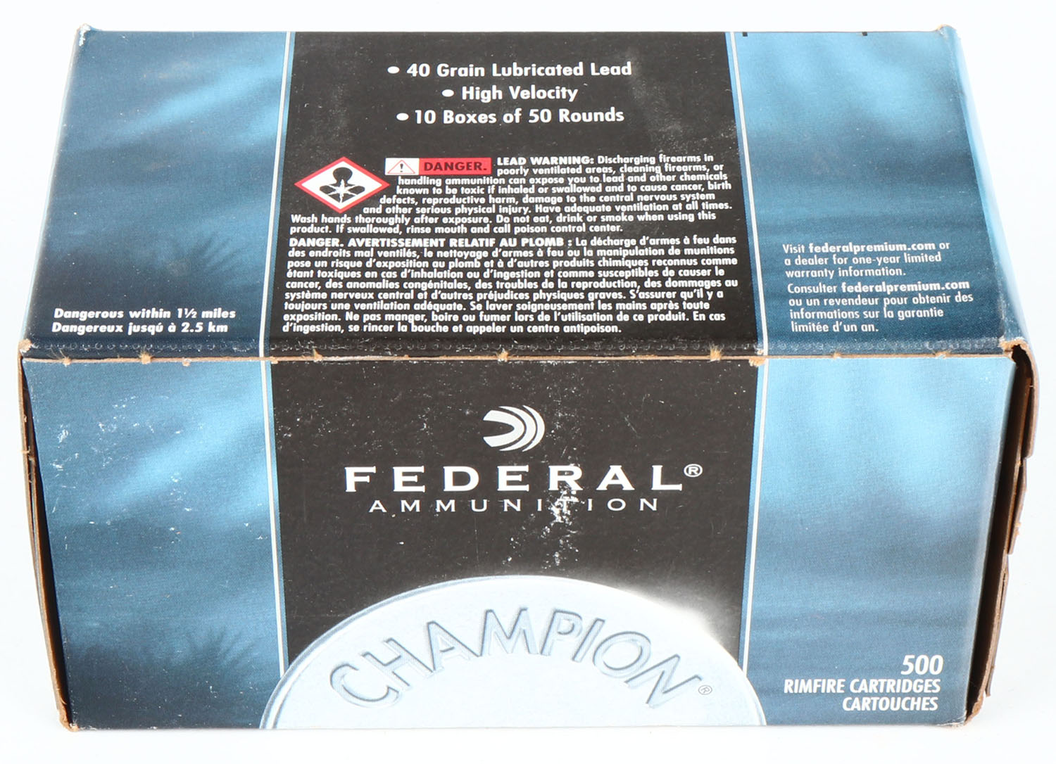 Federal, Champion, .22 Long Rifle, 40 Grain Lubricated Lead, High Velocity, FULL & SEALED, 500rds. 1pc. Blue & black brick, brick is near mint with minty color, only very minor shelf wear, right end has been written on, corners are mostly sharp, edges are crisp. Grade: Excellent ++ - Value: 24 to 36