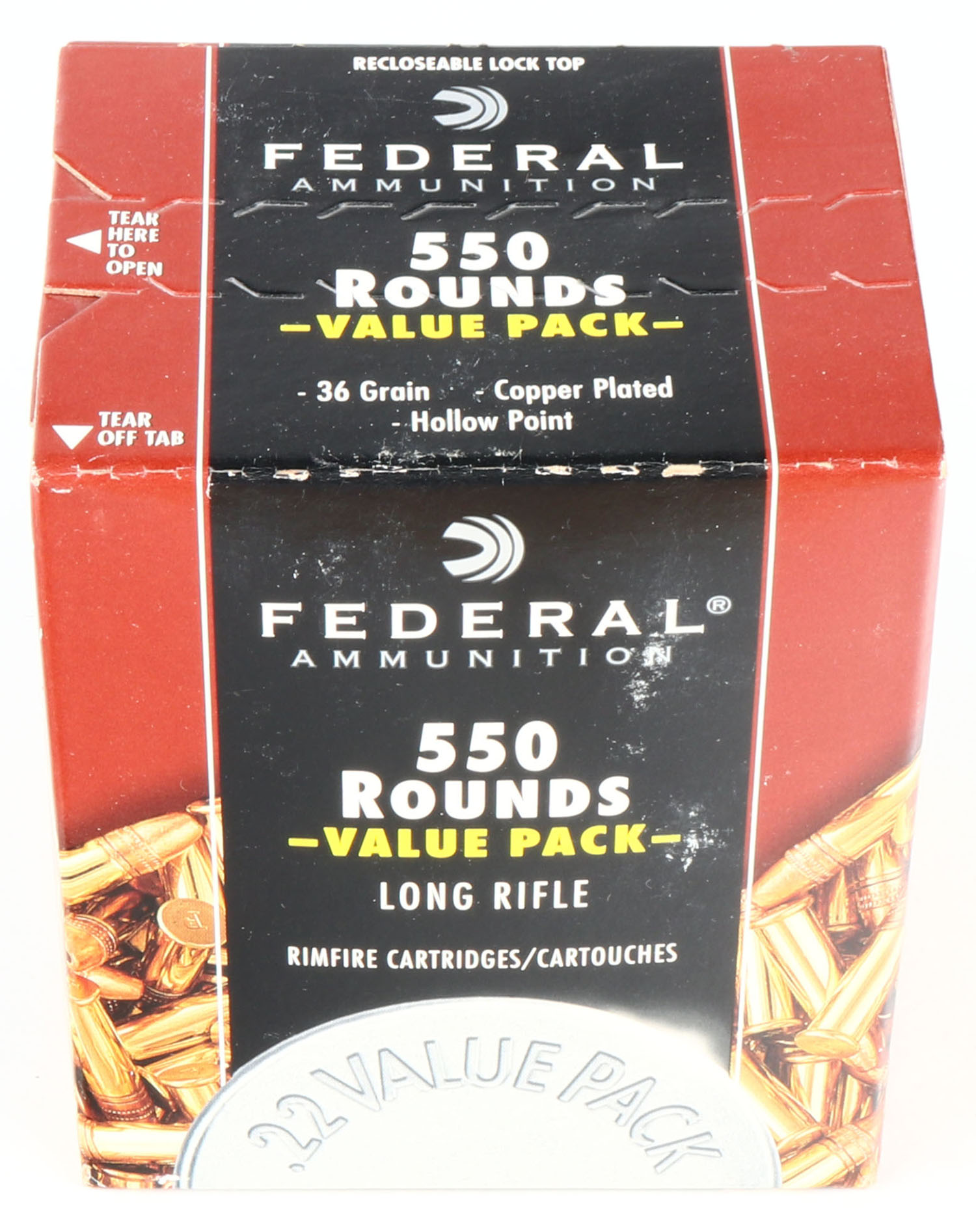 Federal, Value Pack, .22 Long Rifle, 36 Grain Copper Plated Hollow Point, FULL & SEALED, 550rds. 1pc. Multi-colored bulk box, box is near mint with minty color, only very minor shelf wear, corners are sharp, edges are crisp. Grade: Excellent ++ - Value: 24 to 36