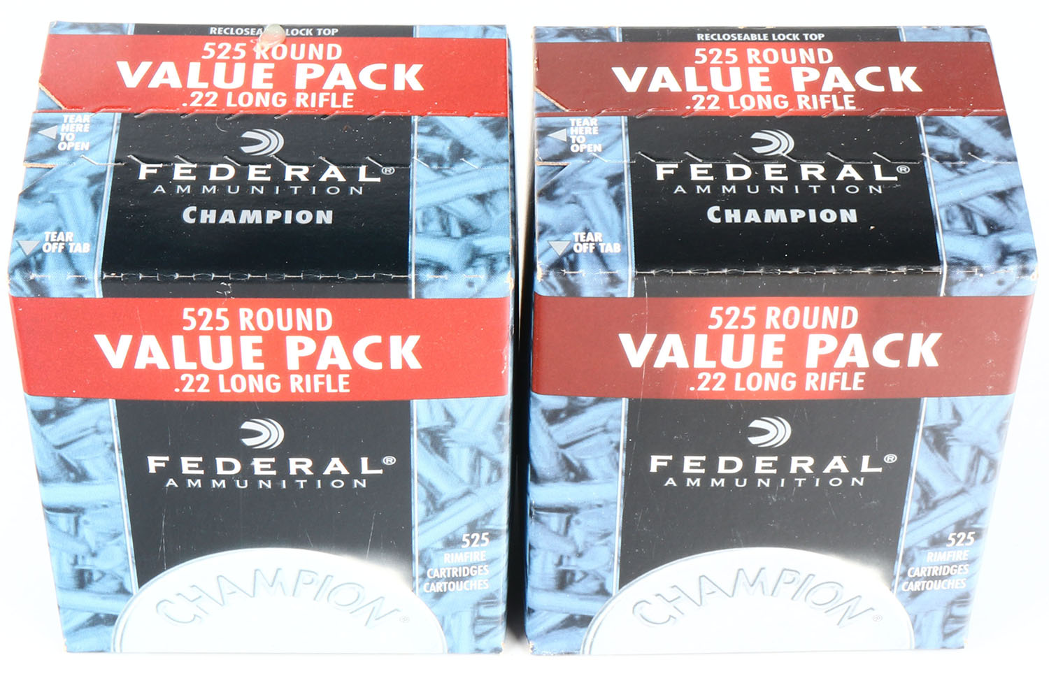 Federal, Lot of (2), Champion Value Pack, .22 Long Rifle, 36 Grain Copper Plated Hollow Point, FULL & SEALED, 525rds. (x2) 1pc. Blue black & red bulk box, boxes are near mint with minty color, only very minor corner wear. Grade: Excellent ++ - Value: 50 to 75
